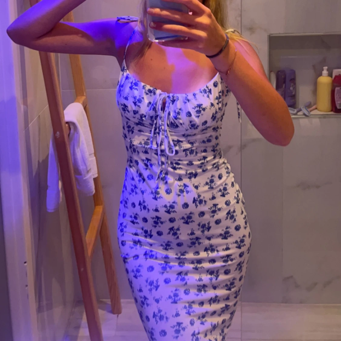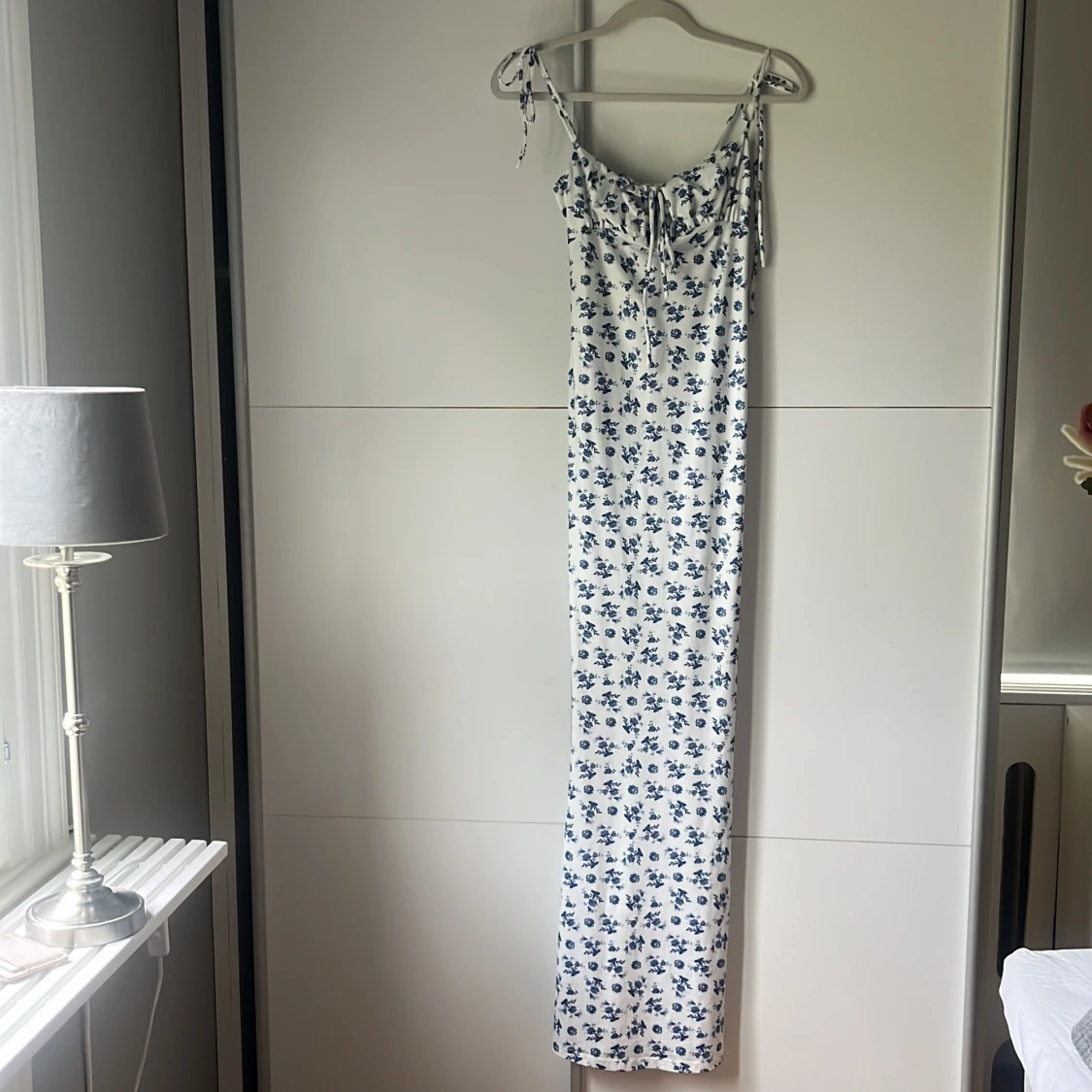Åtsittande vit långklänning med blåa blommor, använd fåtal gånger! 80kr stl xs