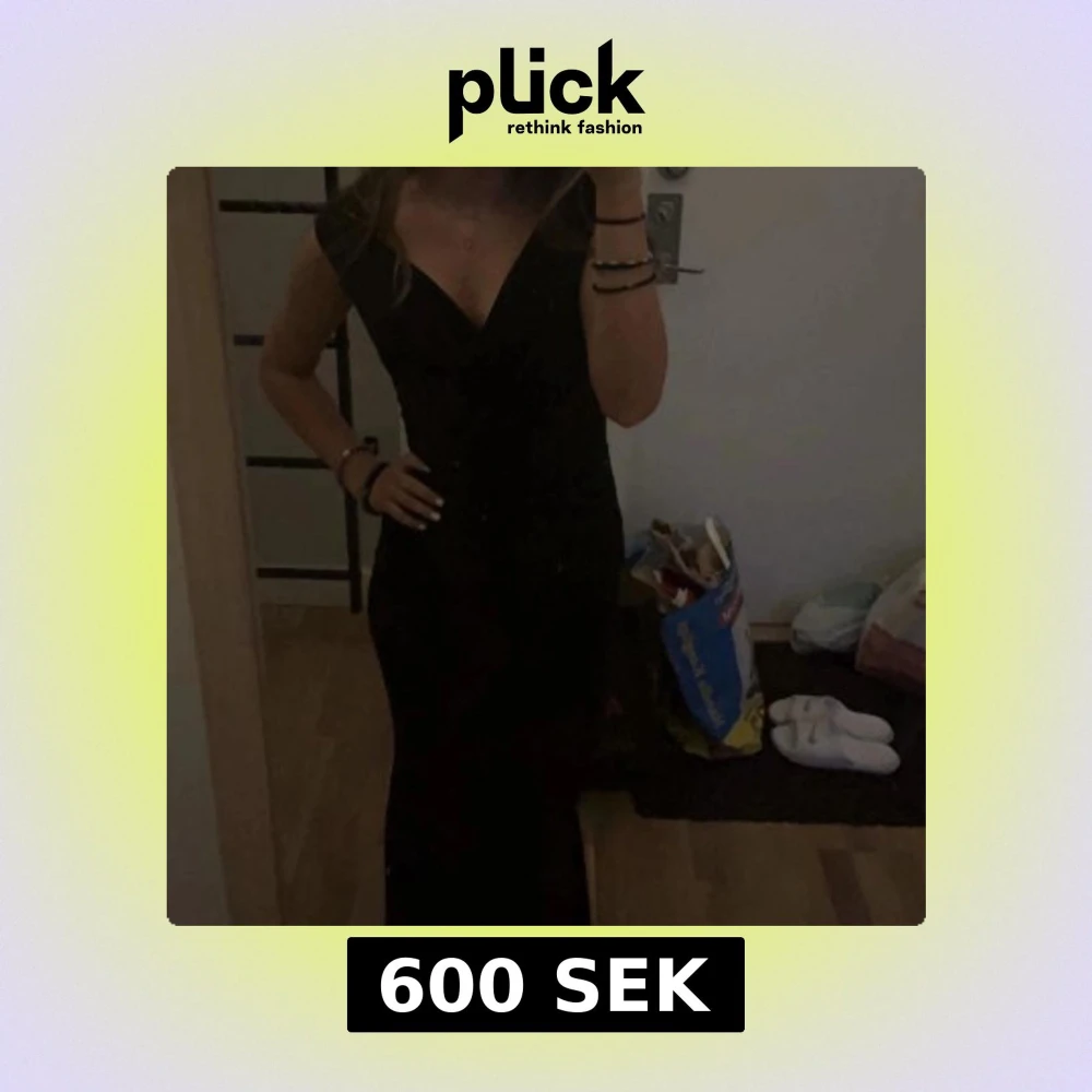 Snygg svart långklänning med djup v-ringning och korta ärmar. Klänningen har en figurnära passform som framhäver siluetten och är perfekt för dig som vill ha en elegant look. Materialet känns mjukt och följsamt mot kroppen. Använd en gång på min bal i nian (2022) och har inte kommit till användning sedan dess!