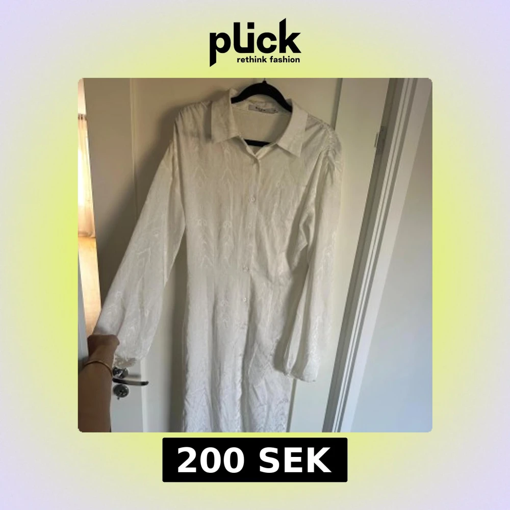 Säljer en elegant vit långklänning från NA-KD med subtilt mönster i tyget. Klänningen har klassisk skjortkrage, knappar hela vägen framtill och långa ärmar med lätt puff. Materialet är mjukt och har en satinliknande finish som ger en lyxig känsla. Går ner till anklarna. En knapp saknas syns på bild två men går enkelt att sy på med knappen som tillkommer se bild 3.