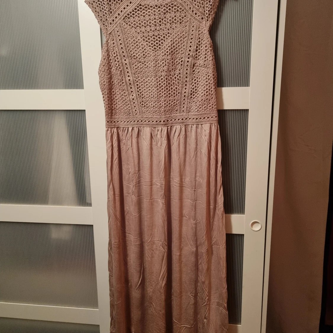 Elegant långklänning från H&M med vackra spetsdetaljer på överdelen. Klänningen har en rund hals och är ärmlös, vilket ger en stilren look. Perfekt för speciella tillfällen. Ny, aldrig använd.