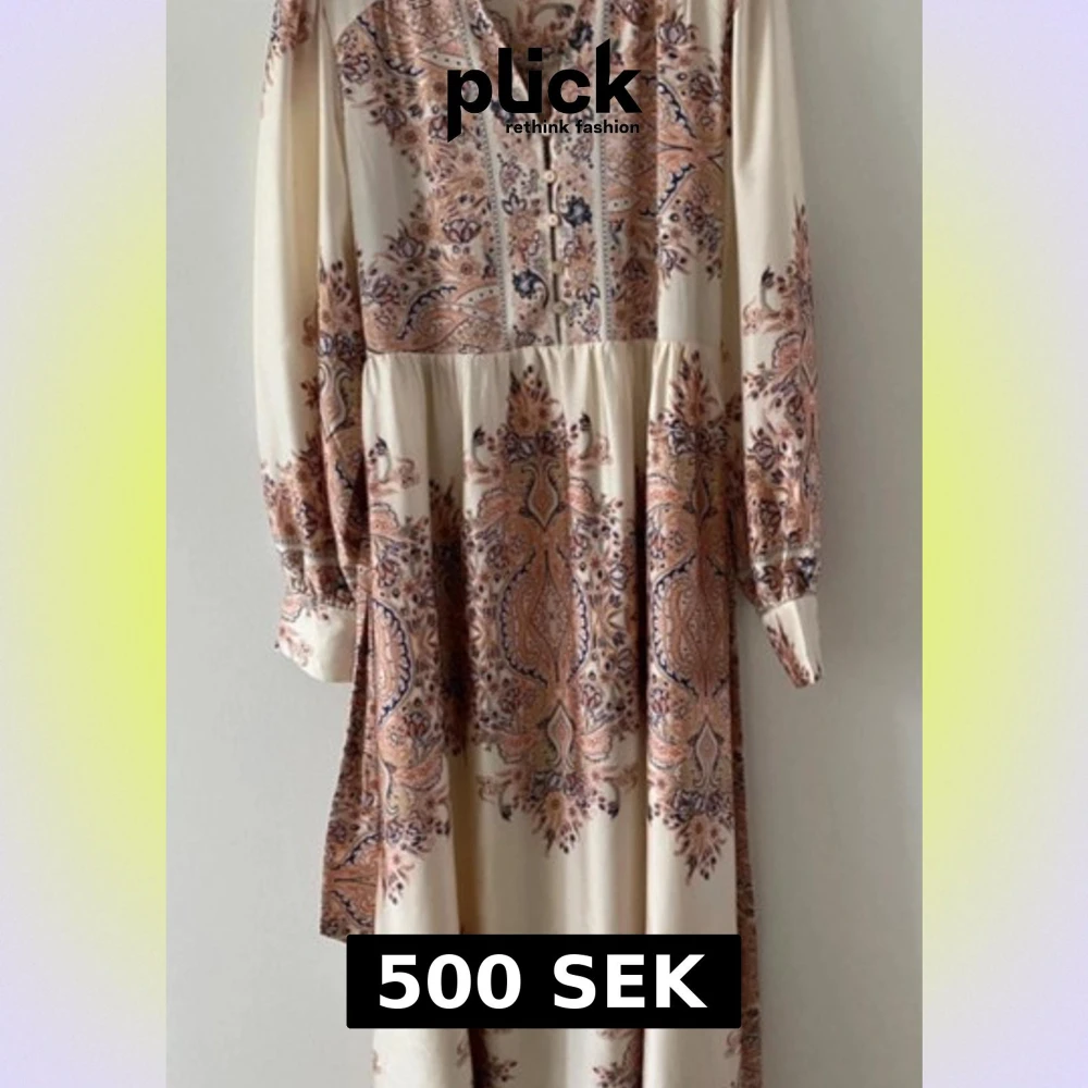 Snygg långklänning från Neo Noir i ljusbeige med blommigt paisleymönster i rosa, blått och brunt. Klänningen har långärmade puffärmar, knappar framtill, markerad midja med bälte och lätt rynkad krage. Underbart satin-tyg!