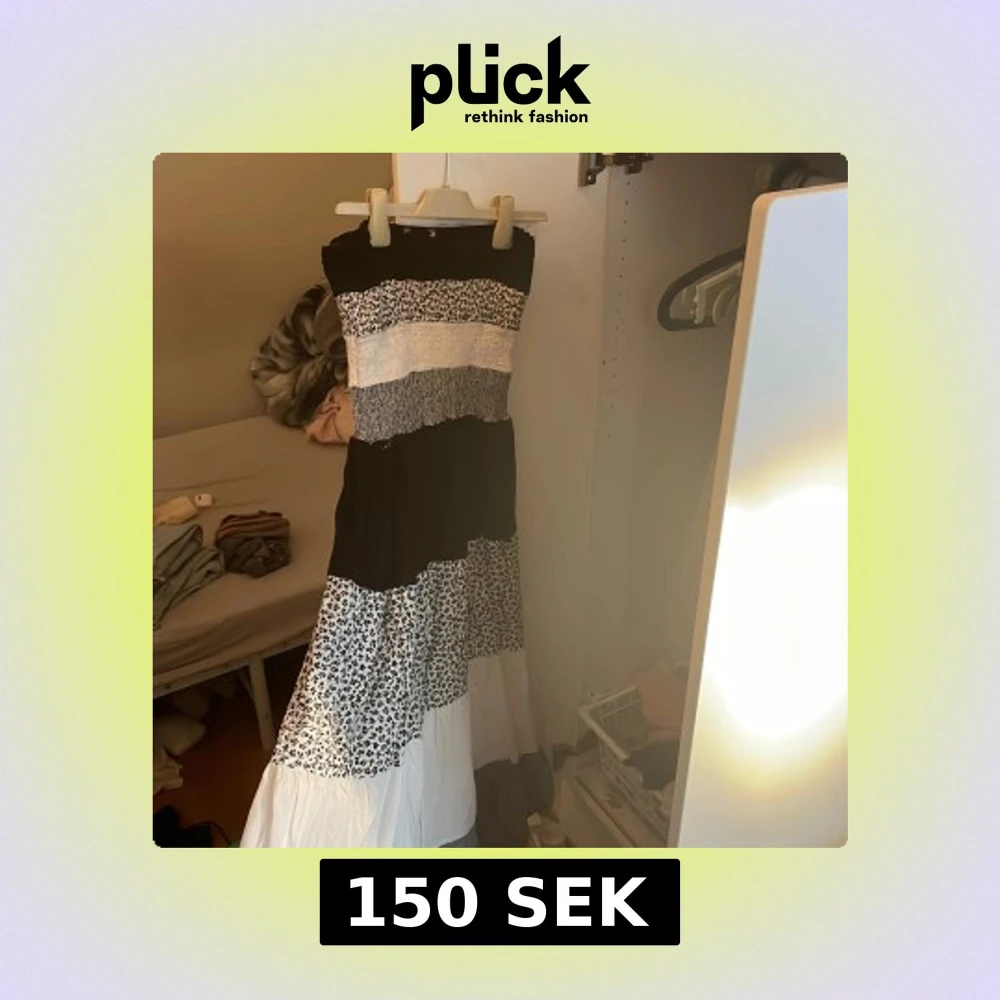 Säljer en långklänning i svart och vitt med flera olika mönster. Klänningen har breda block i blommigt, randigt och enfärgat tyg. Den är ärmlös och har en luftig, flowy passform som känns riktigt chill och somrig.