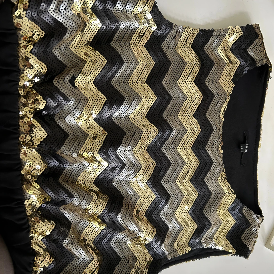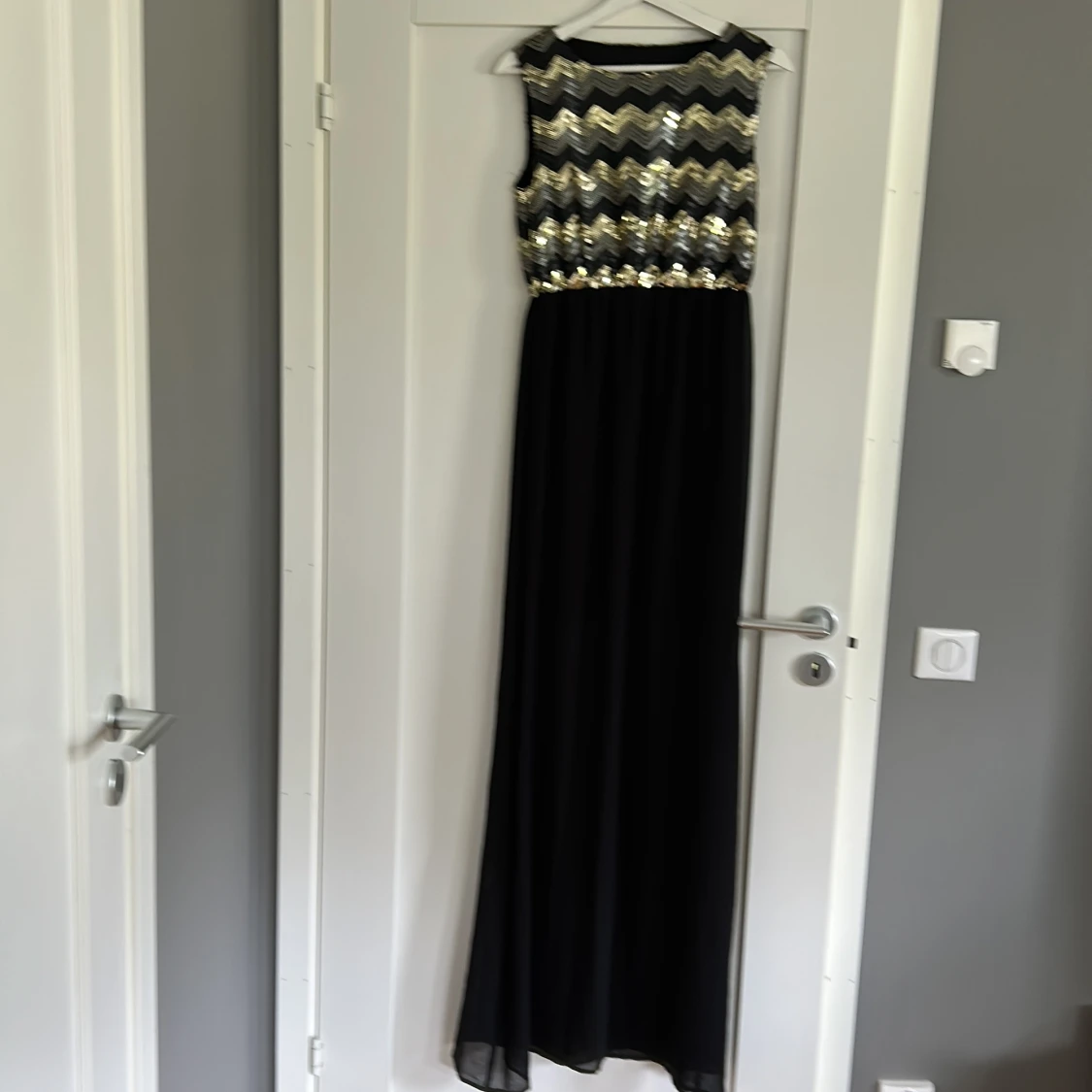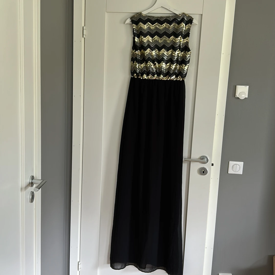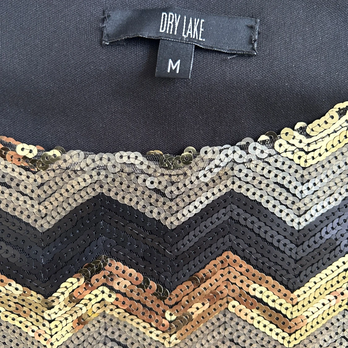 Snygg långklänning från Dry Lake med svart kjol och överdel täckt av glittriga paljetter i guld, silver och svart i ett zickzackmönster. Ärmlös modell med rund halsringning, perfekt för att sticka ut på festen.