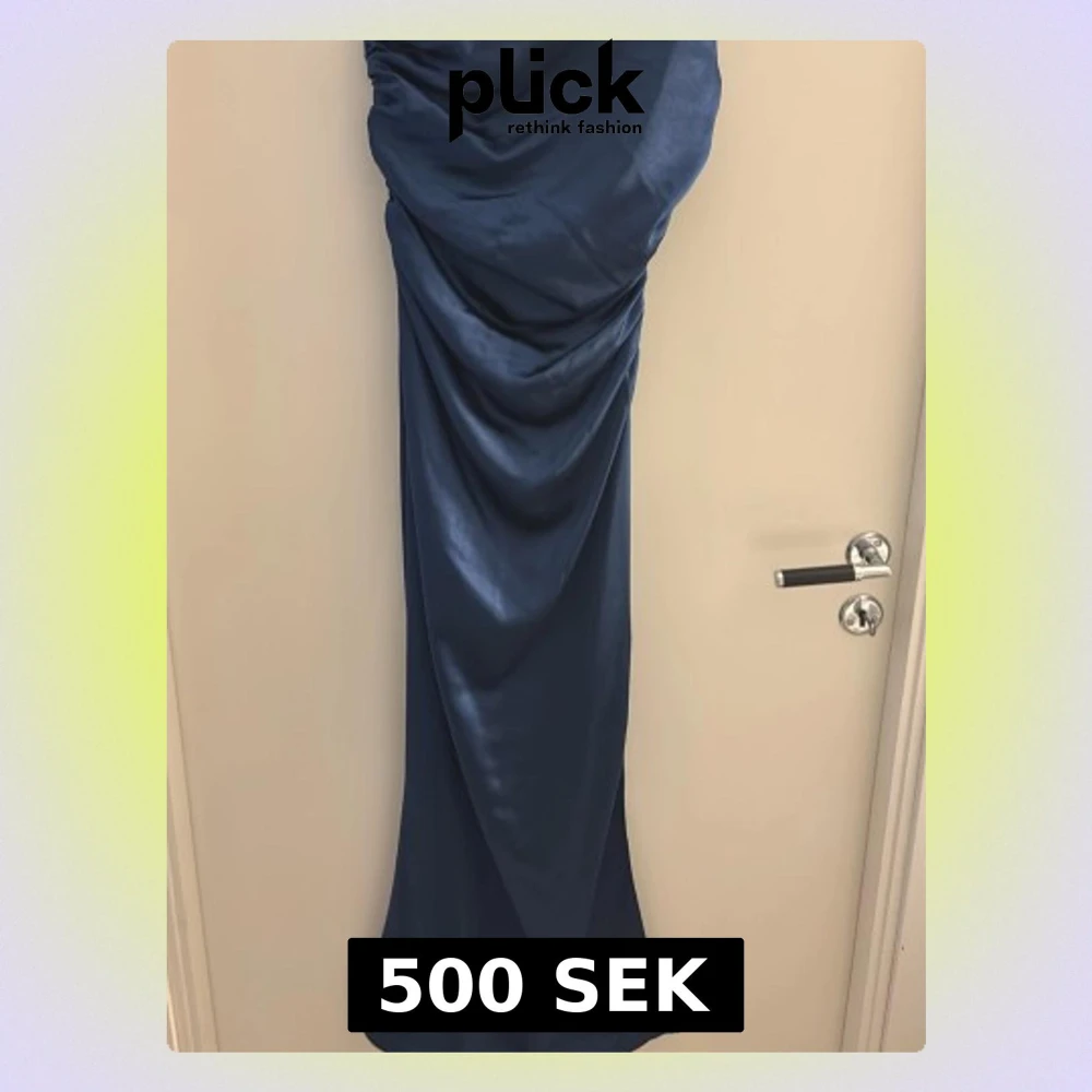 Elegant marinblå balklänning i glansigt satinmaterial med draperad framsida. Klänningen har en figurnära passform och faller snyggt längs kroppen. Perfekt för speciella tillfällen när du vill känna dig extra fin.
