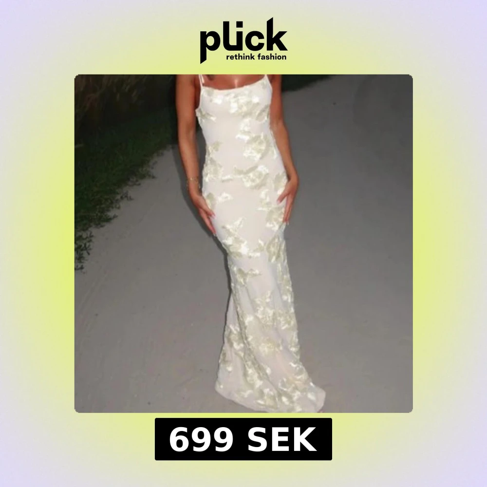 Säljer en elegant vit långklänning med blommigt mönster. Klänningen har smala axelband och figurnära passform som framhäver siluetten. Perfekt för sommarens speciella tillfällen/ Bal