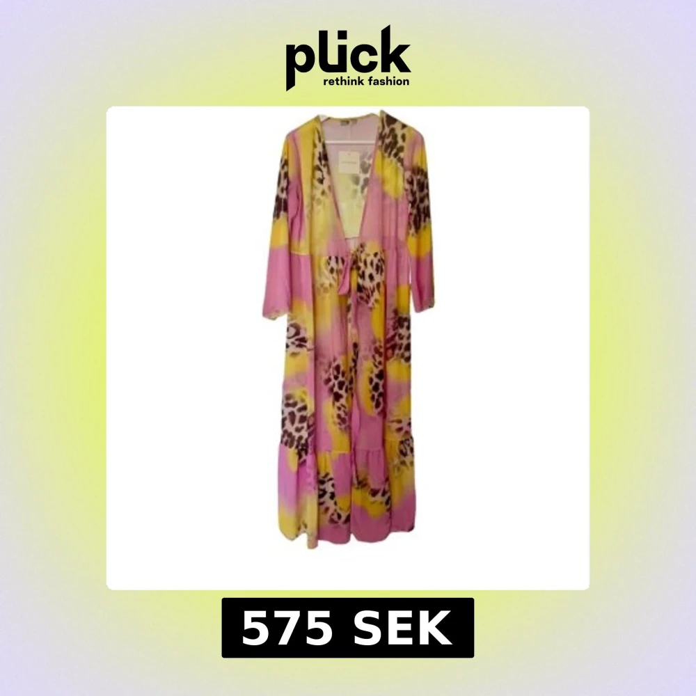 Färgstark långklänning från Estee Brown Paris i 100% polyester. Klänningen har ett coolt leopardmönster i rosa och gult, v-ringning, långa ärmar och knytband i midjan. Perfekt för dig som vill sticka ut med en unik och trendig look.