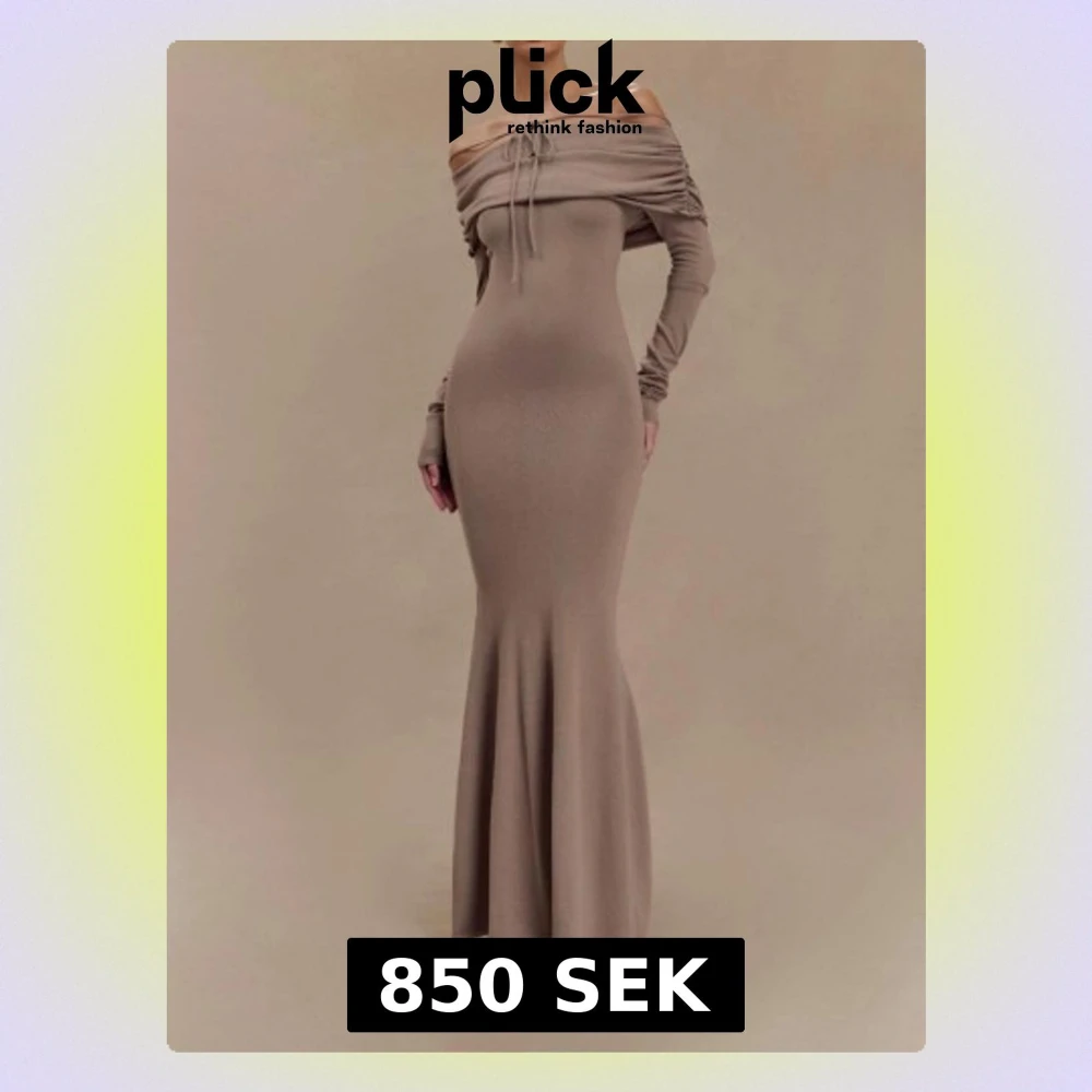 Trendig beige långklänning med offshoulder-design och långa ärmar. Klänningen har snörning framtill vid bysten och en figurnära passform som framhäver siluetten. Tillverkad i mjukt stretchigt material, perfekt för dig som gillar stilrena och eleganta looks.