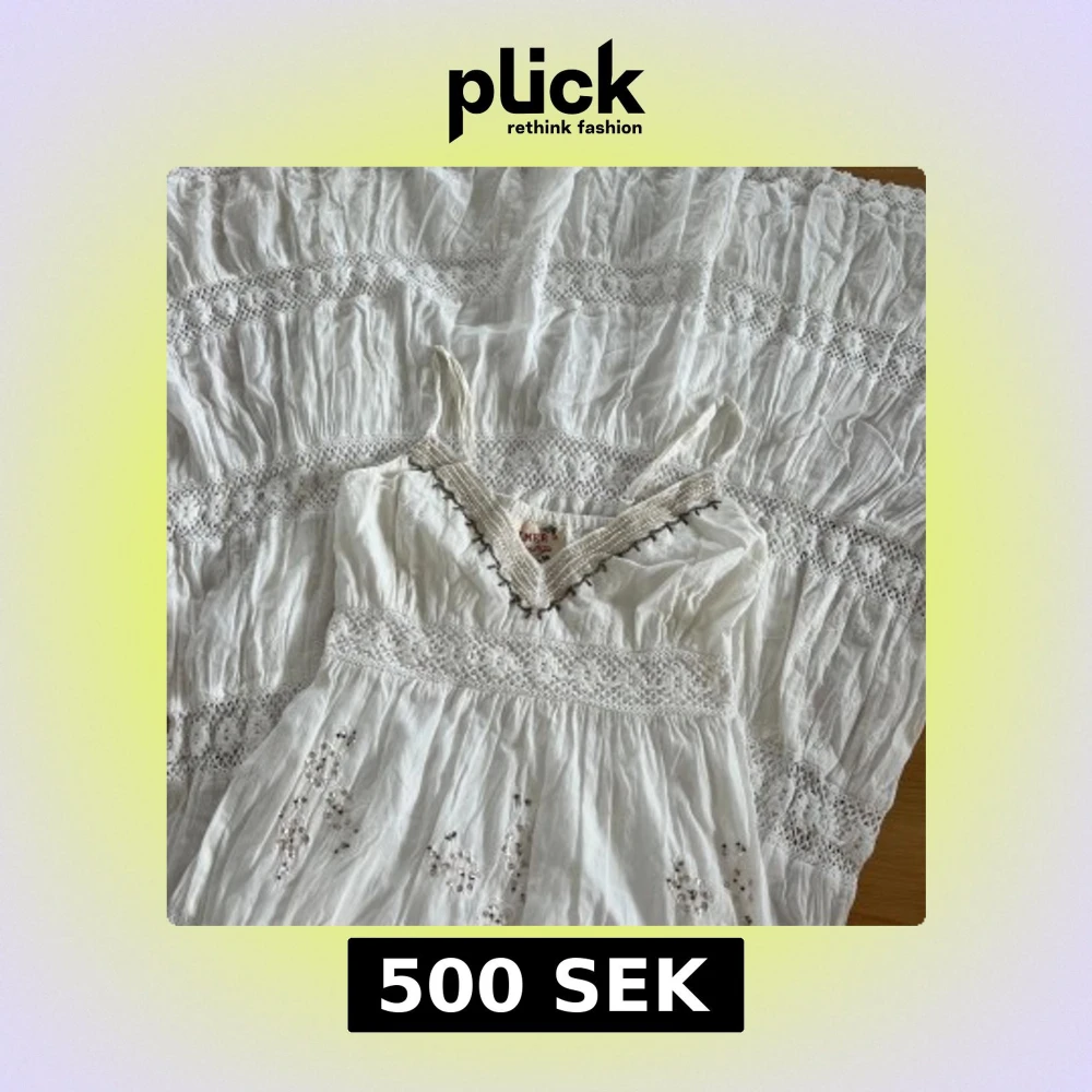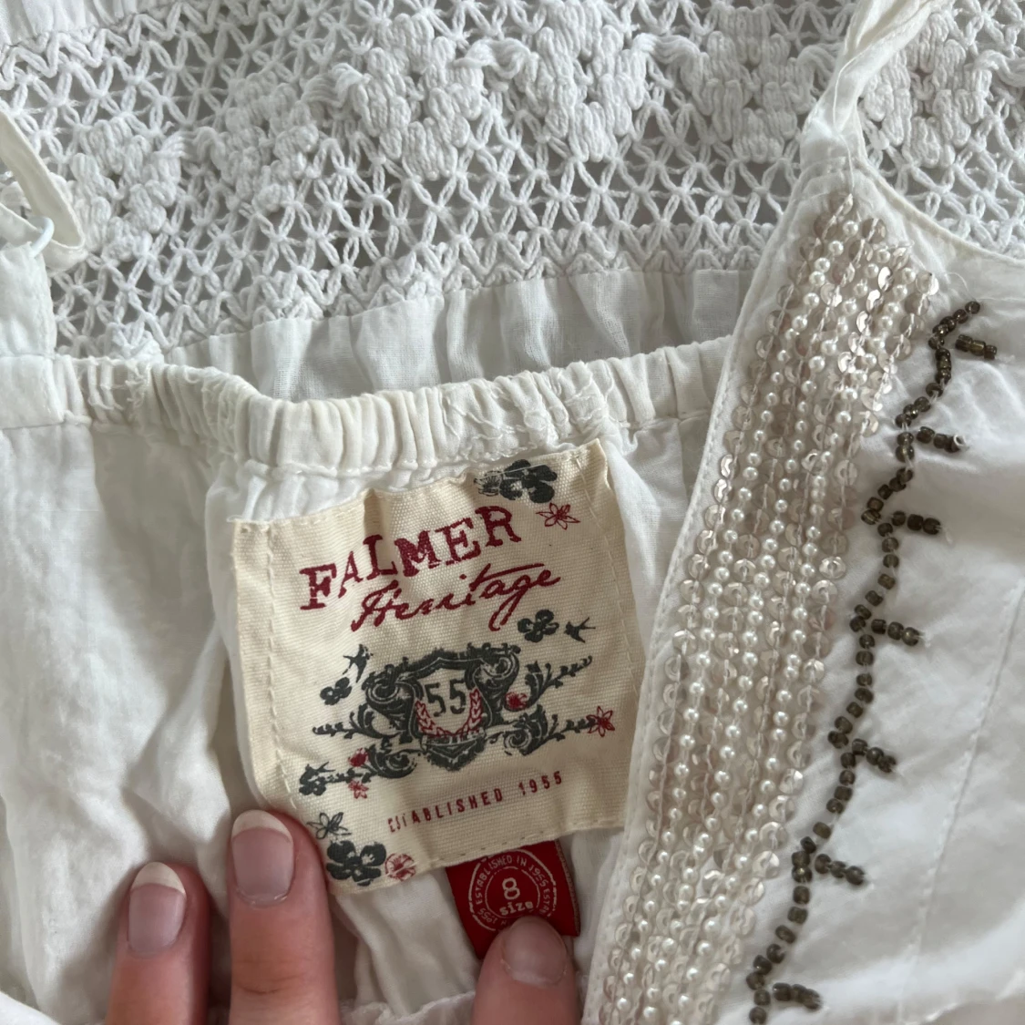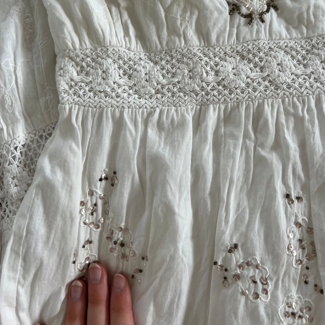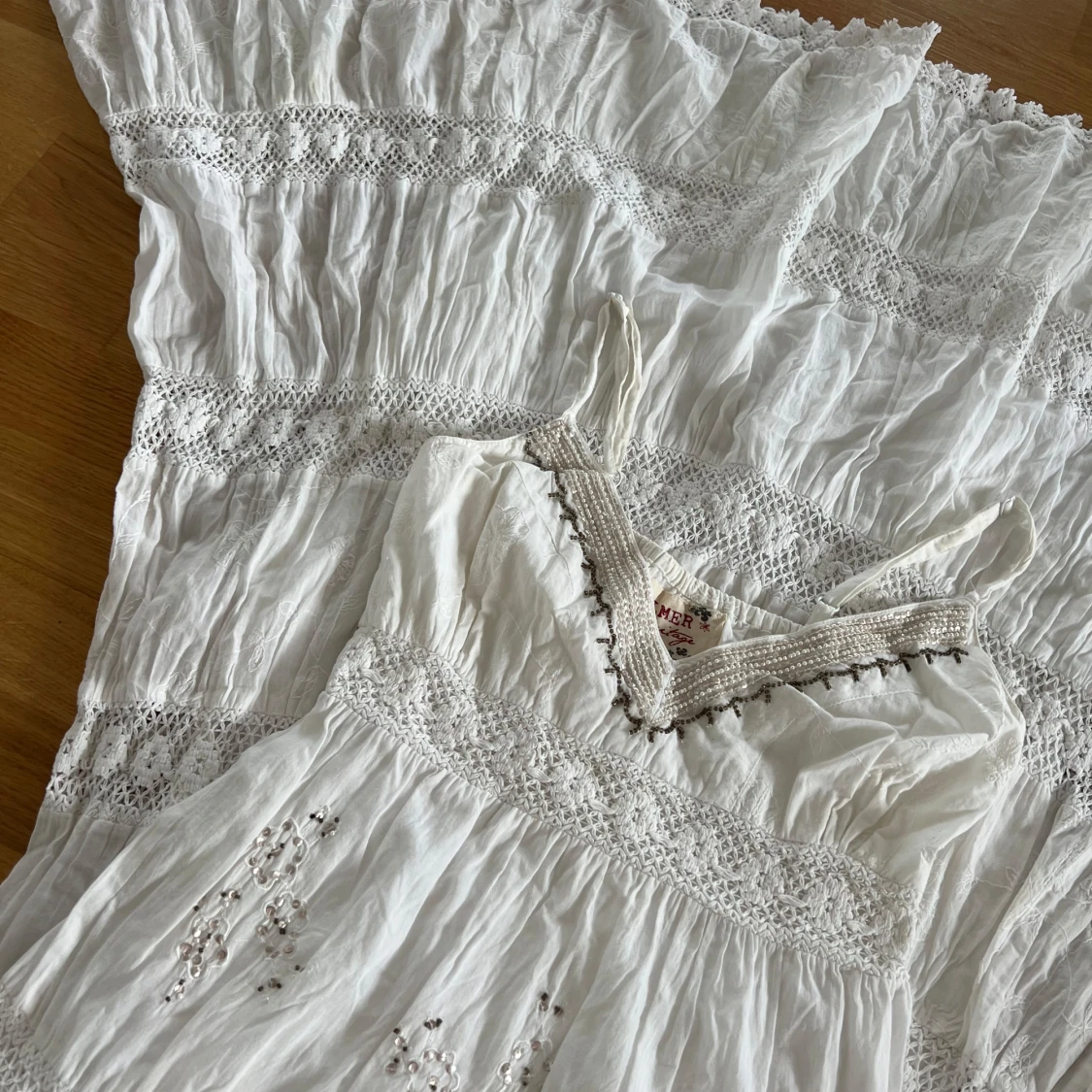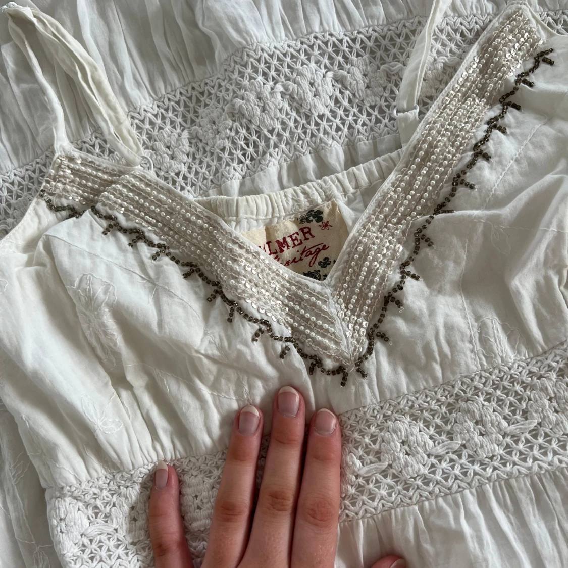 Superfin vit långklänning från Falmer Heritage med broderade detaljer, spetsinslag och pärlor längs v-ringningen🌸xs/s (finns några gula nyanser nertill klänningen)