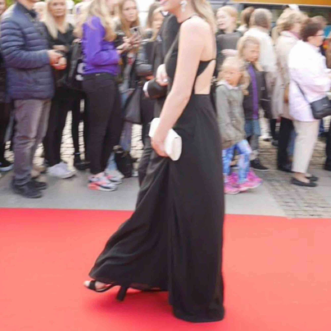 Svart balklänning med öppen rygg, använd vid 2 tillfällen, säljes i bra skick! Passar 36/38, lång i modellen. Jag är 167cm och hade 10cm klackar, den nådde ner till marken. Kan hämtas i Borås, annars tillkommer frakt✨