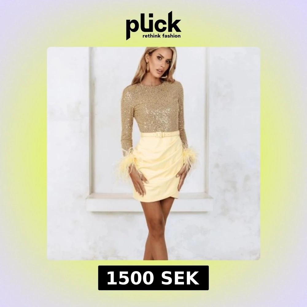 Superfin kortklänning med glittrig guldöverdel och ljusgul kjol från Lavish Alice. Klänningen har långa ärmar med fluffiga fjäderdetaljer vid handlederna och ett matchande bälte i midjan. Nypris 3350kr. Kontakta mig för egna bilder, priset kan diskuteras 🤍