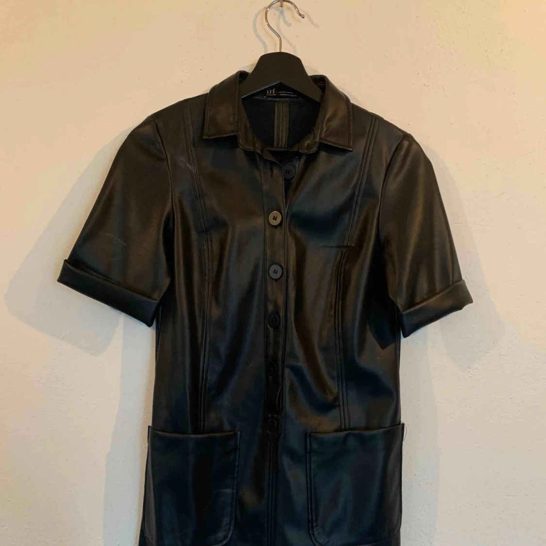 Helt oanvänd svart skinnklänning med knappar och två fickor framtill.