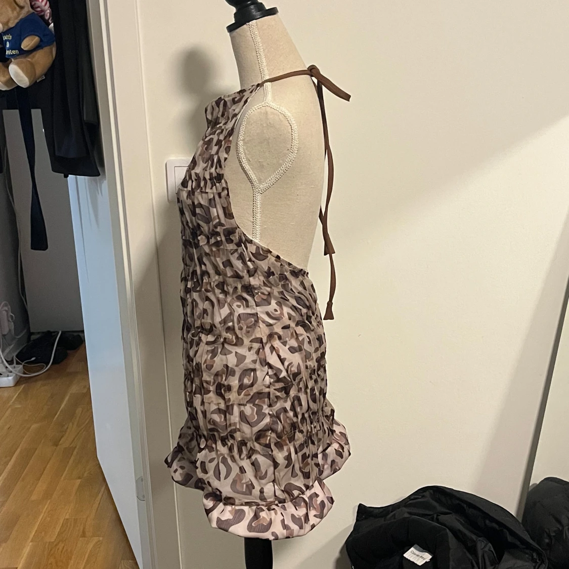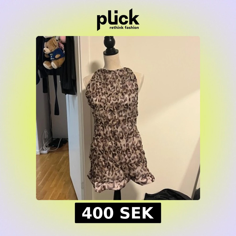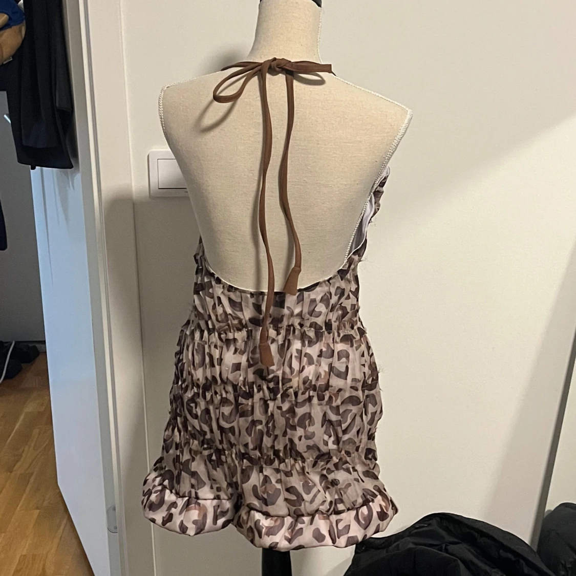 Snygg ärmlös klänning med leopard mönster . Klänningen har en halterneck-design med knytband i nacken. Perfekt för en somrig dag eller en avslappnad kväll. Storlek xs/s