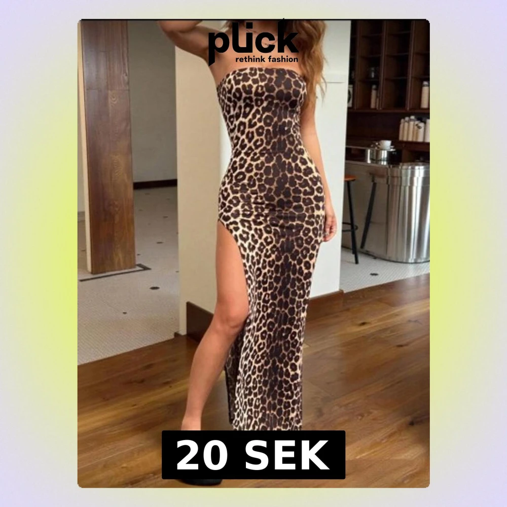 Snygg axelbandslös långklänning med leopardmönster och hög slits på ena sidan. Aldrig använd