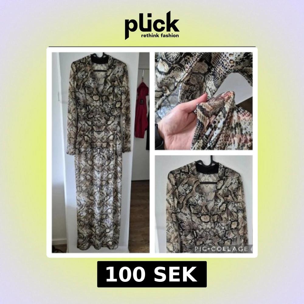 Snygg långklänning med coolt ormmönster i beige, bruna och svarta toner. Klänningen har omlott-skärning, lång ärm och v-ringad hals. Mjuk och stretchig känsla, perfekt för dig som vill sticka ut.
