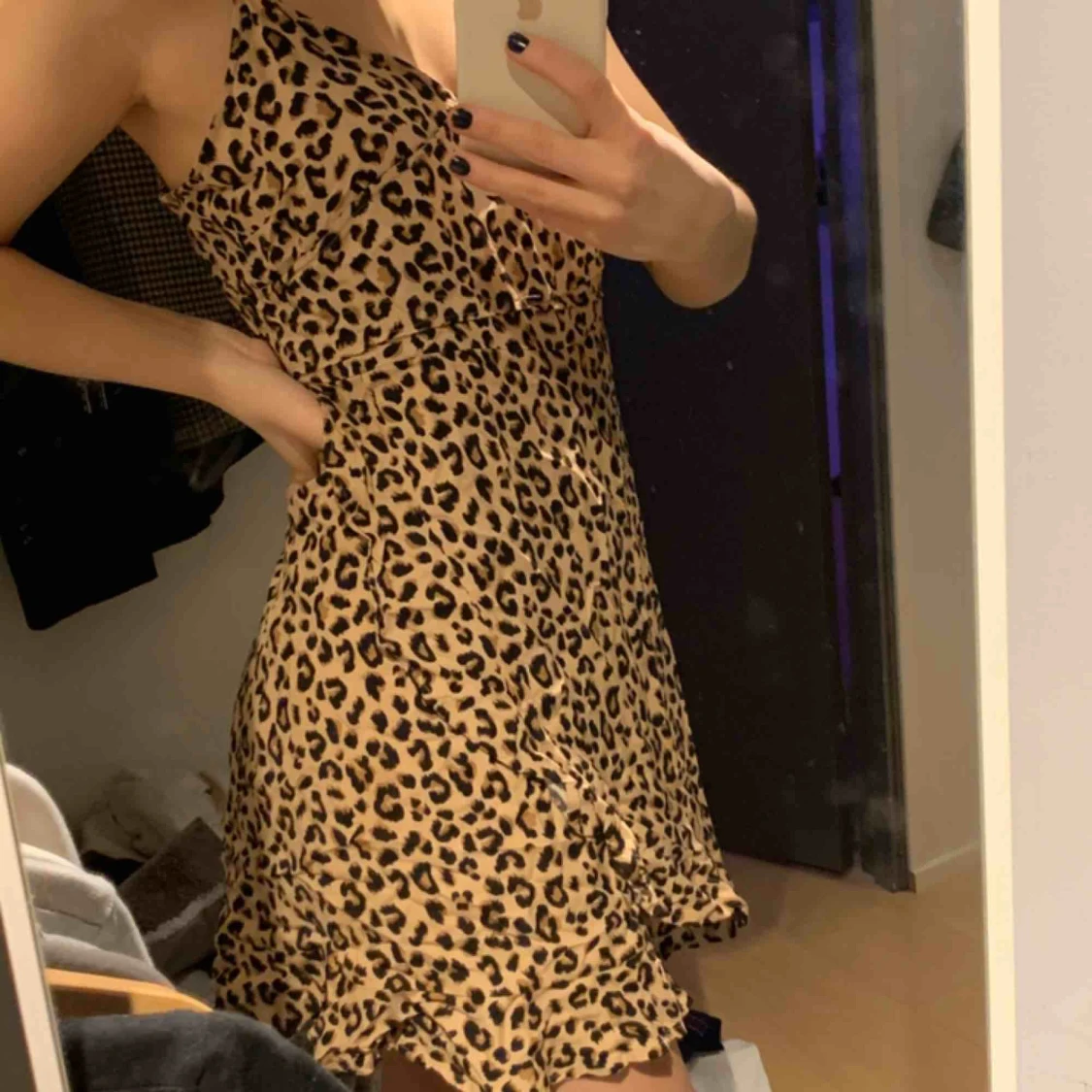 Fin klänning med leopard mönster, har storlek 40 motsvarar M kan jag gissa, men sitter som en stor S. Har knutit banden uppe i axlarna så dem är lite kortare.