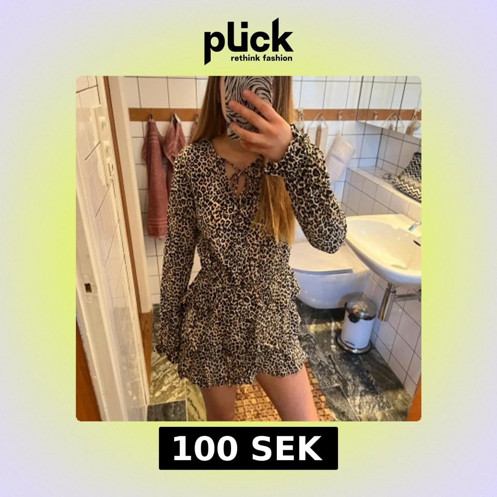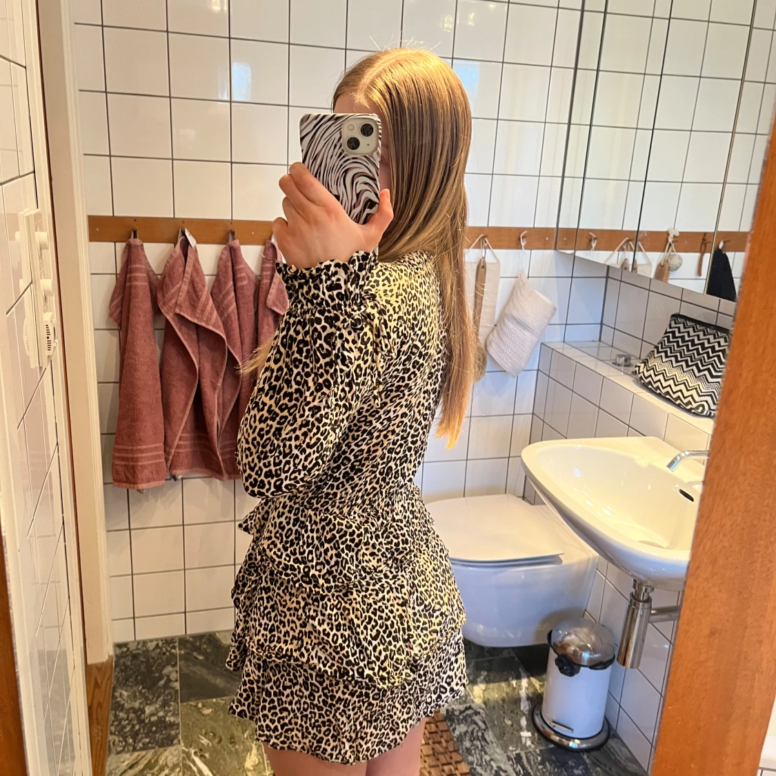 Säljer en kort leopardmönstrad klänning från Motel med långa ärmar och volangdetaljer. Klänningen har knytning vid halsen och en smickrande passform med markerad midja.