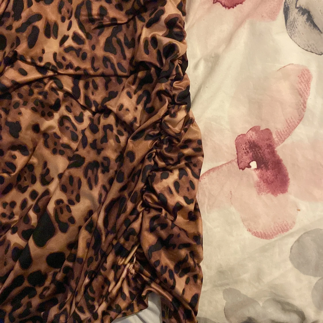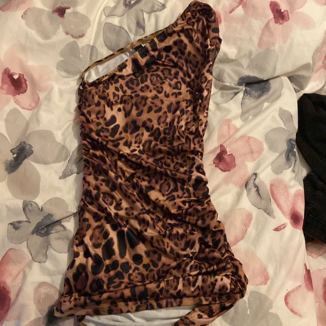 Snygg leopardmönstrad klänning från Shein i en tight passform. Klänningen är axelbandslös och har en kort längd, perfekt för en kväll ute. Materialet är mjukt och stretchigt för en bekväm känsla.