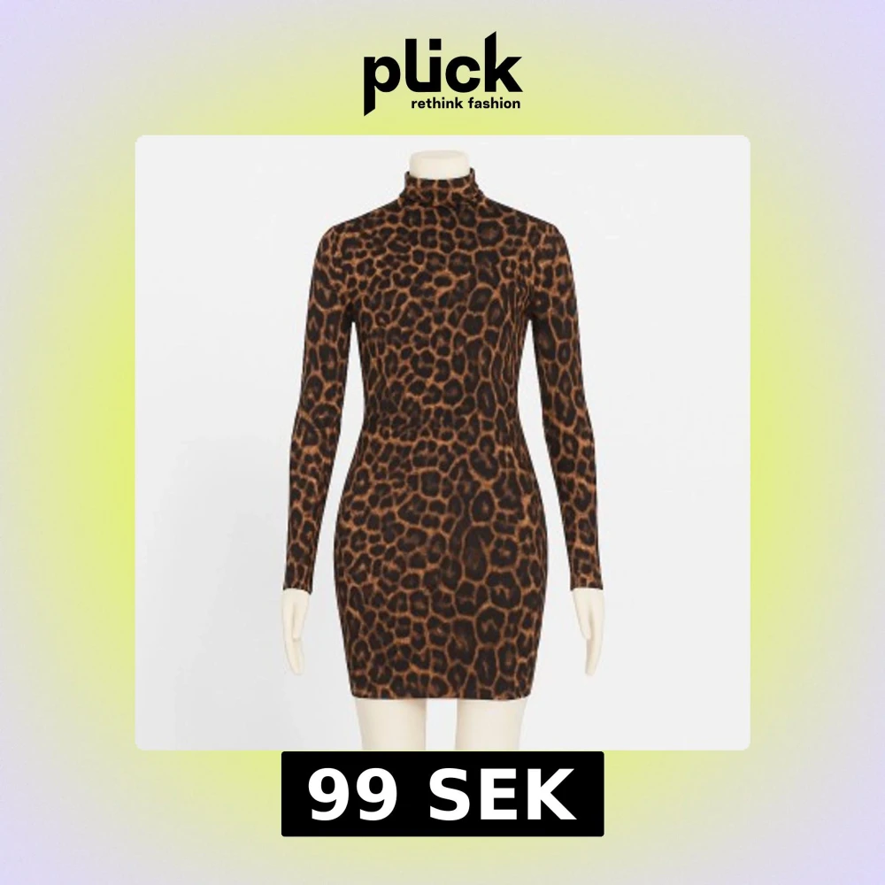 Snygg tight leopardmönstrad kortklänning från PrettyLittleThing med lång ärm och hög krage. Klänningen har bruna och svarta toner och är tillverkad i ett stretchigt syntetmaterial som sitter figurnära och markerar siluetten.
