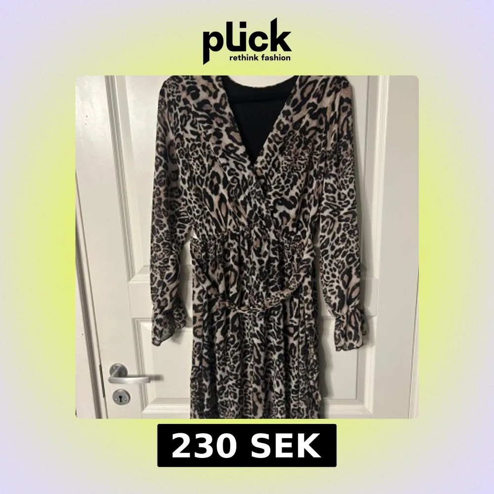 Trendig leopardmönstrad klänning med omlott-design och långa ärmar. Perfekt för att sticka ut med stil. Jag vet inte riktigt vilken storlek det är då det inte står men skulle säga runt storlek S