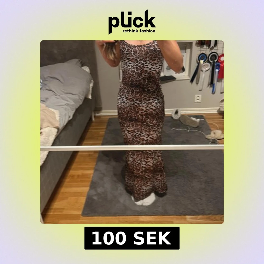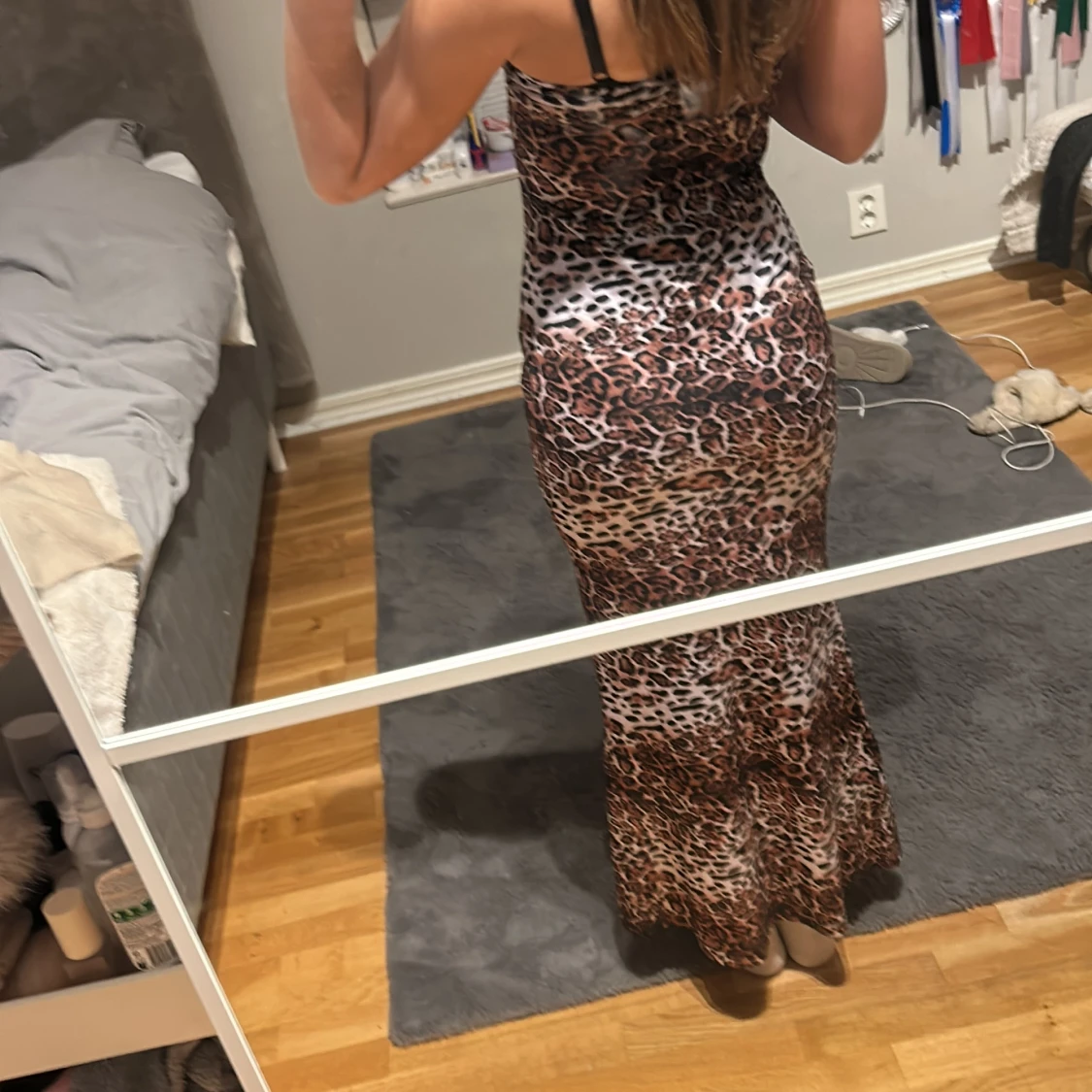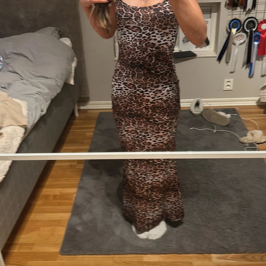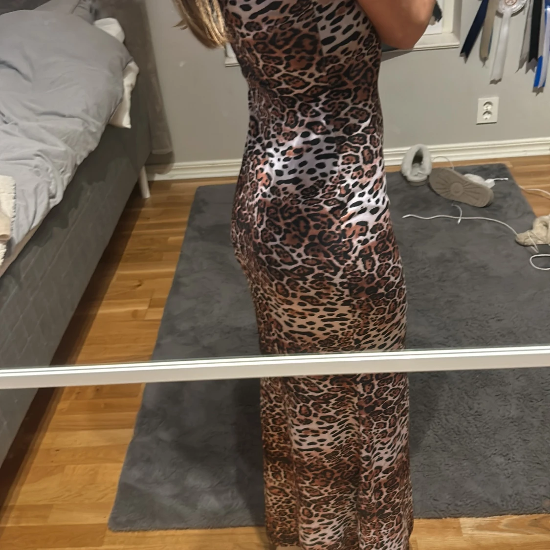 Snygg leopardmönstrad långklänning med tight passform. Klänningen är ärmlös och har ett djärvt mönster som verkligen sticker ut. Perfekt för att göra ett statement!