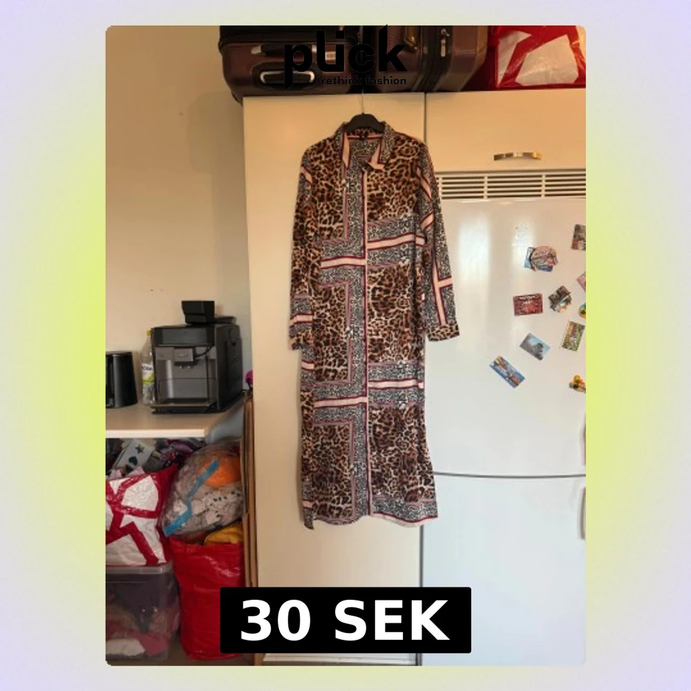 Säljer en lång skjortklänning från Vero Moda i storlek XL. Kanske passar en L mer. Klänningen har leopardmönster blandat med grafiska svarta och vita detaljer samt röda och lila ränder. Den har krage, knappar framtill och långa ärmar. Materialet är mjuk och lätt polyester. Mer använd men fortfarande fint skick. Midjebandet saknas.