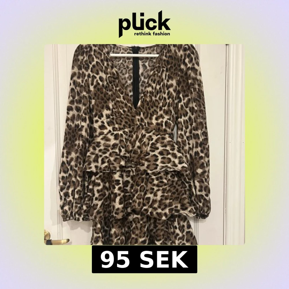 Kort klänning med leopardmönster och volanger. Djup v-ringning, långa ärmar med resår vid handlederna och dragkedja i ryggen.