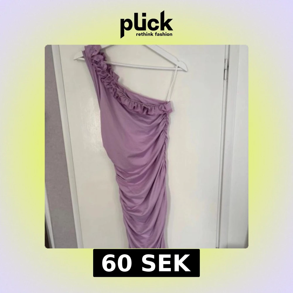 Lång med oneshoulder och volangdetalj längs axeln. Klänningen har draperad effekt på sidan och är figurnära. För fler bilder kontakta mig.