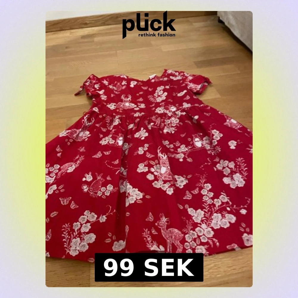 Supersöt röd klänning från Lindex Kids med vita blommor, fjärilar, kaniner och hjortar som mönster. Klänningen har korta ärmar, knappar bak och en utställd kjol. Perfekt för dig som gillar djur och naturinspirerade prints.