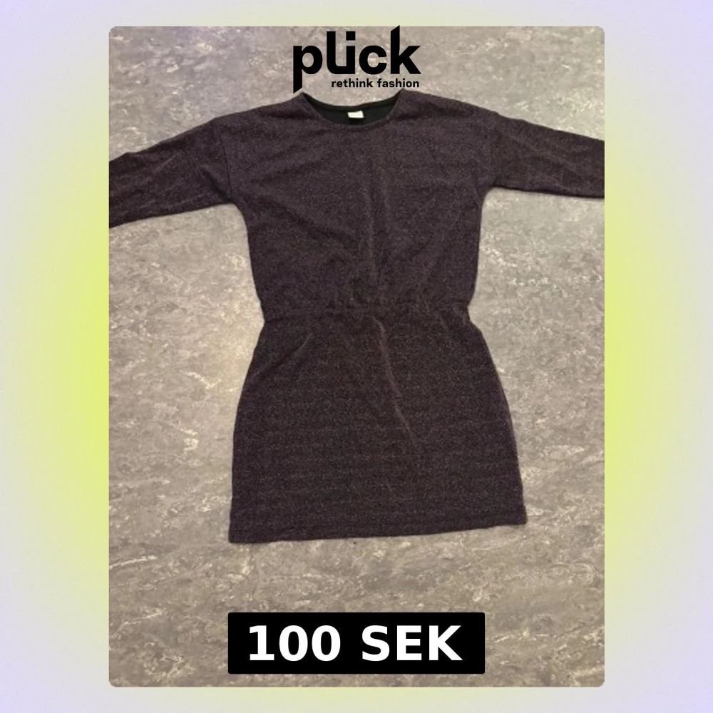 Snygg mörklila kortklänning med glittrigt tyg och rund halsringning. Klänningen har långa ärmar och markerad midja för en smickrande siluett. Perfekt för dig som vill sticka ut med lite extra glitter.