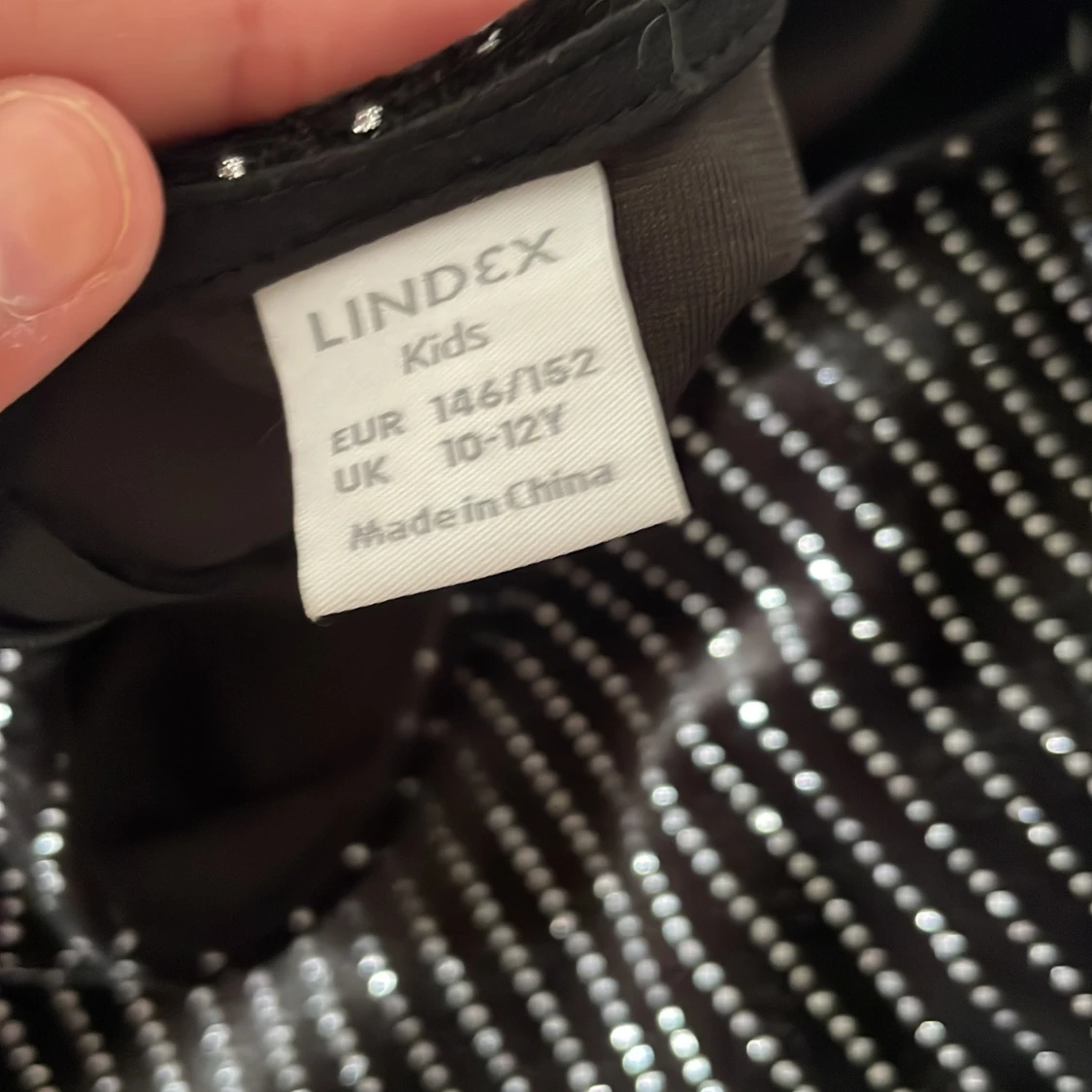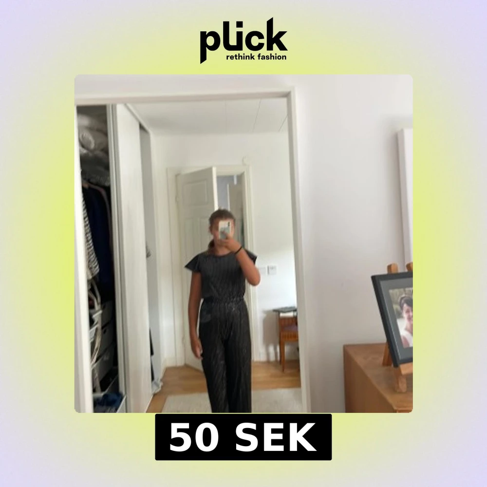 Snygg svart byxdress från Lindex med glittriga ränder och vida ben. Byxdressen har korta volangärmar och markerad midja. Perfekt för dig som vill sticka ut med en cool och trendig look.