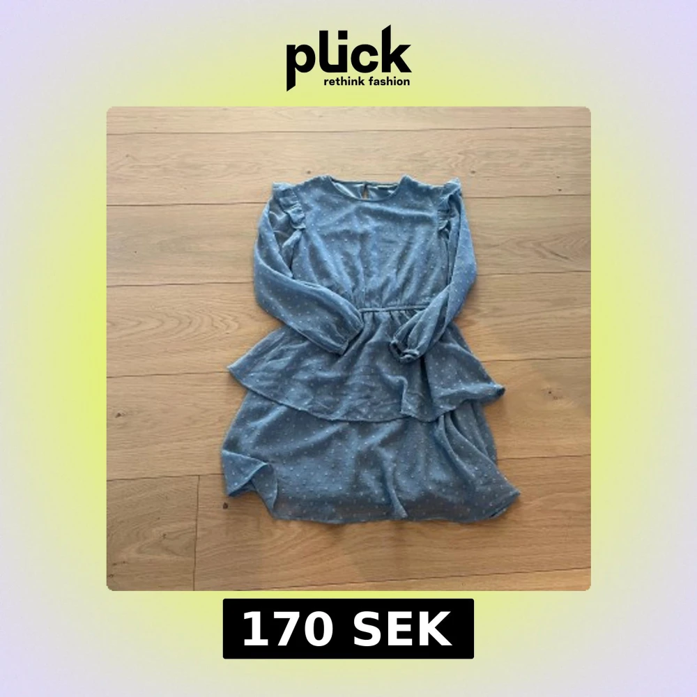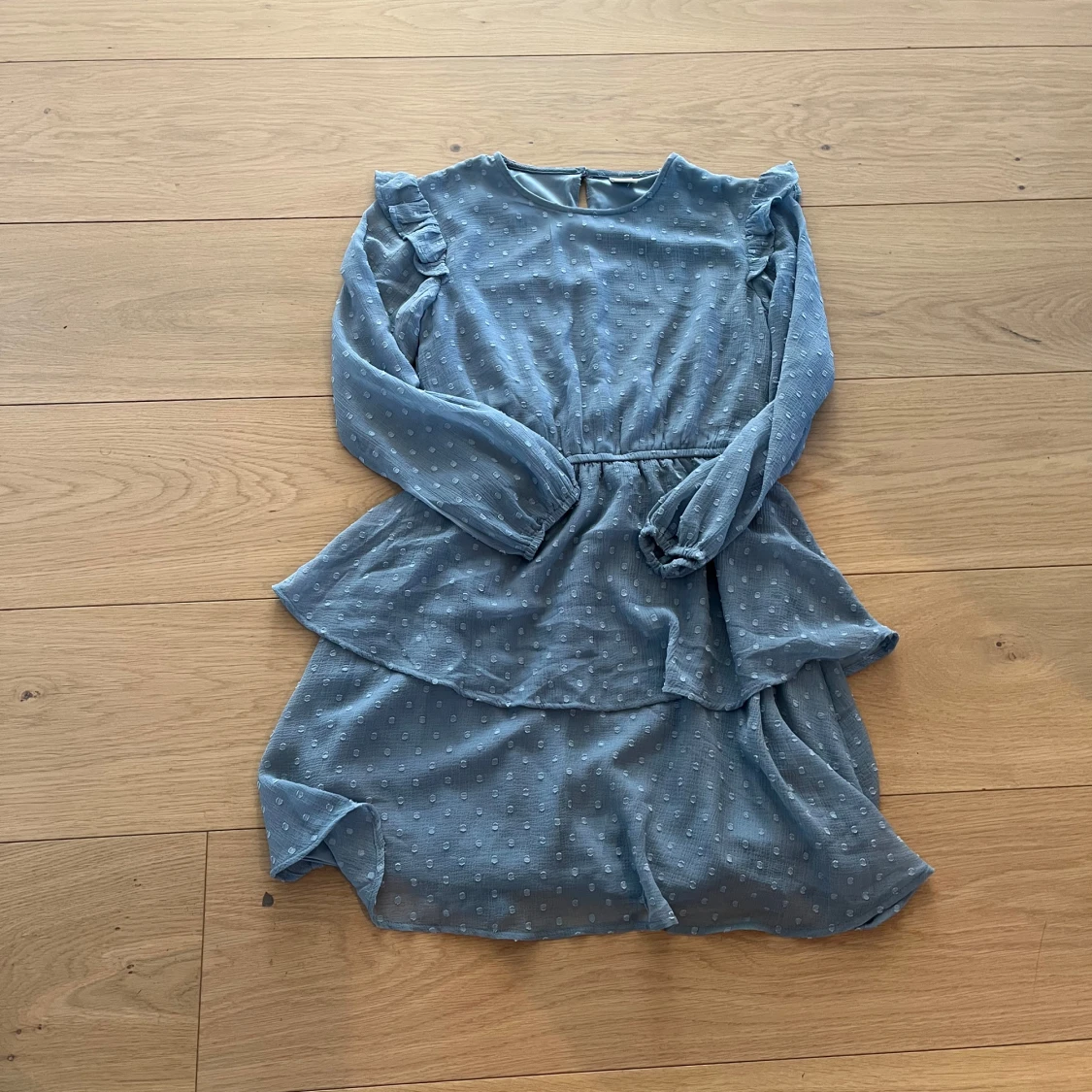 Charmig blå klänning med volangdetaljer och prickigt mönster. Klänningen har långa ärmar och en mjuk, flytande passform som ger en romantisk känsla.