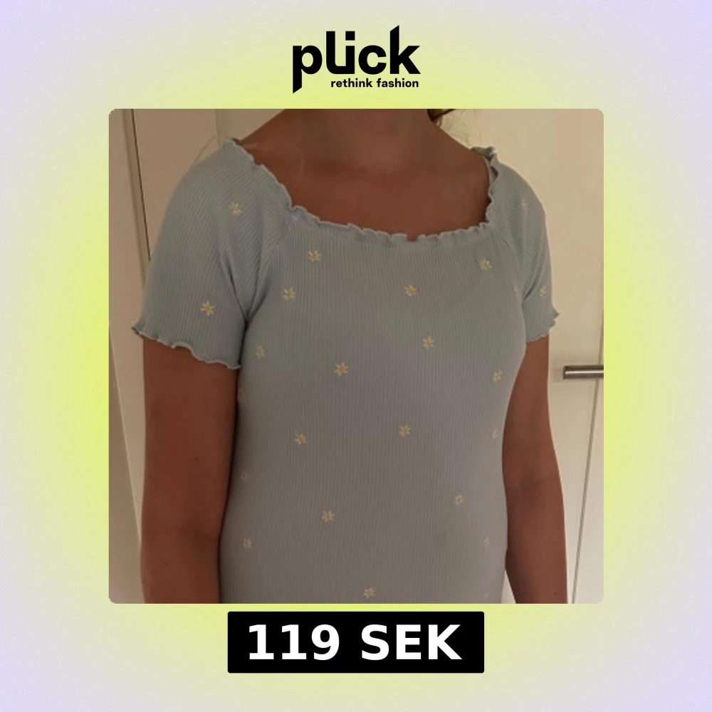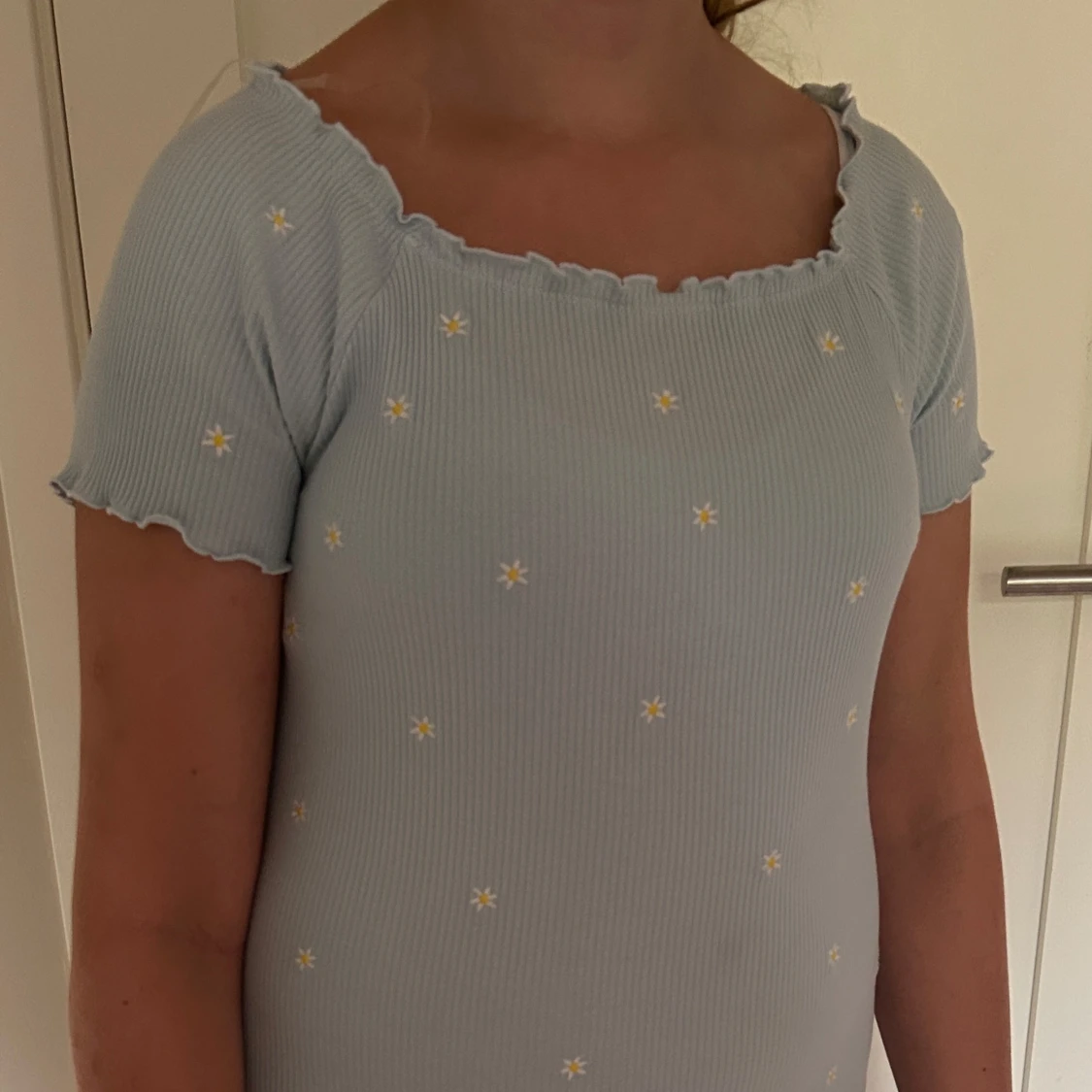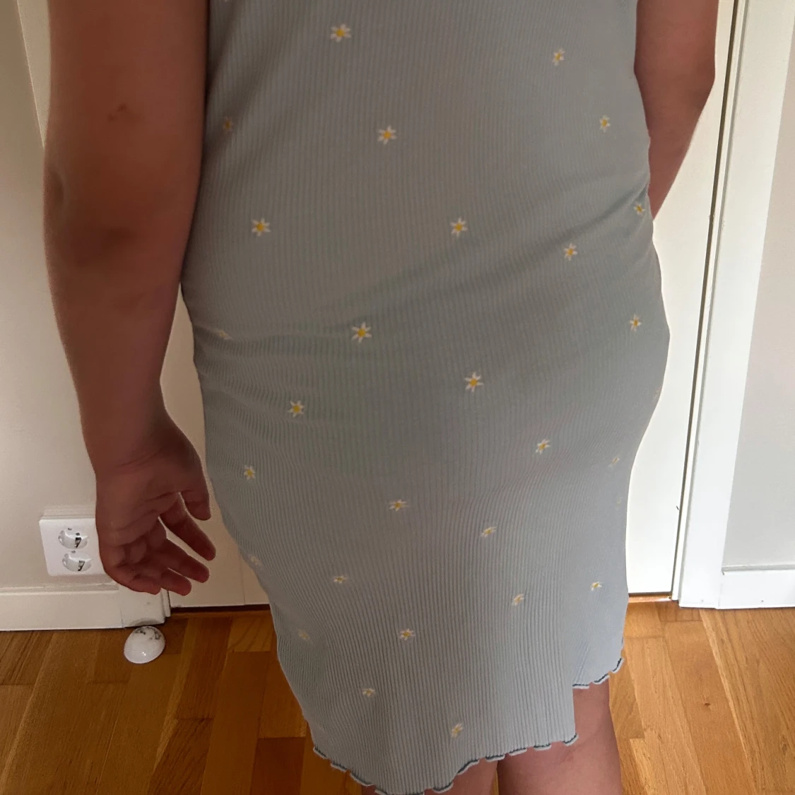 Supersöt ljusblå ribbad kortklänning med små broderade blommor i vitt och gult. Klänningen har korta ärmar, vågig kant vid halsringning och ärmslut samt en figurnära passform. Perfekt för sommarens alla tillfällen!