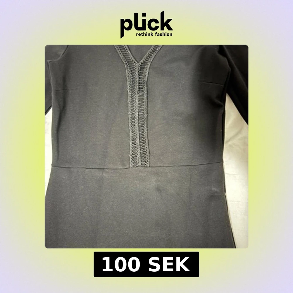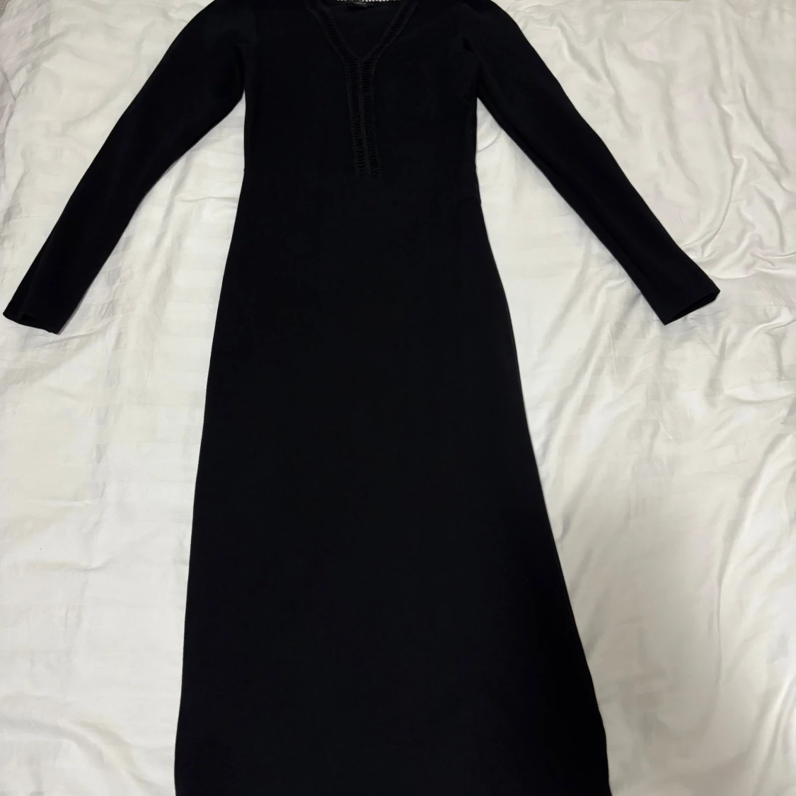 Stilren svart långklänning med långa ärmar och snygg v-ringning med dekorativ spetsdetalj framtill. Klänningen har en figurnära passform och är perfekt för dig som gillar en klassisk look med en twist. Materialet känns mjukt och följsamt.