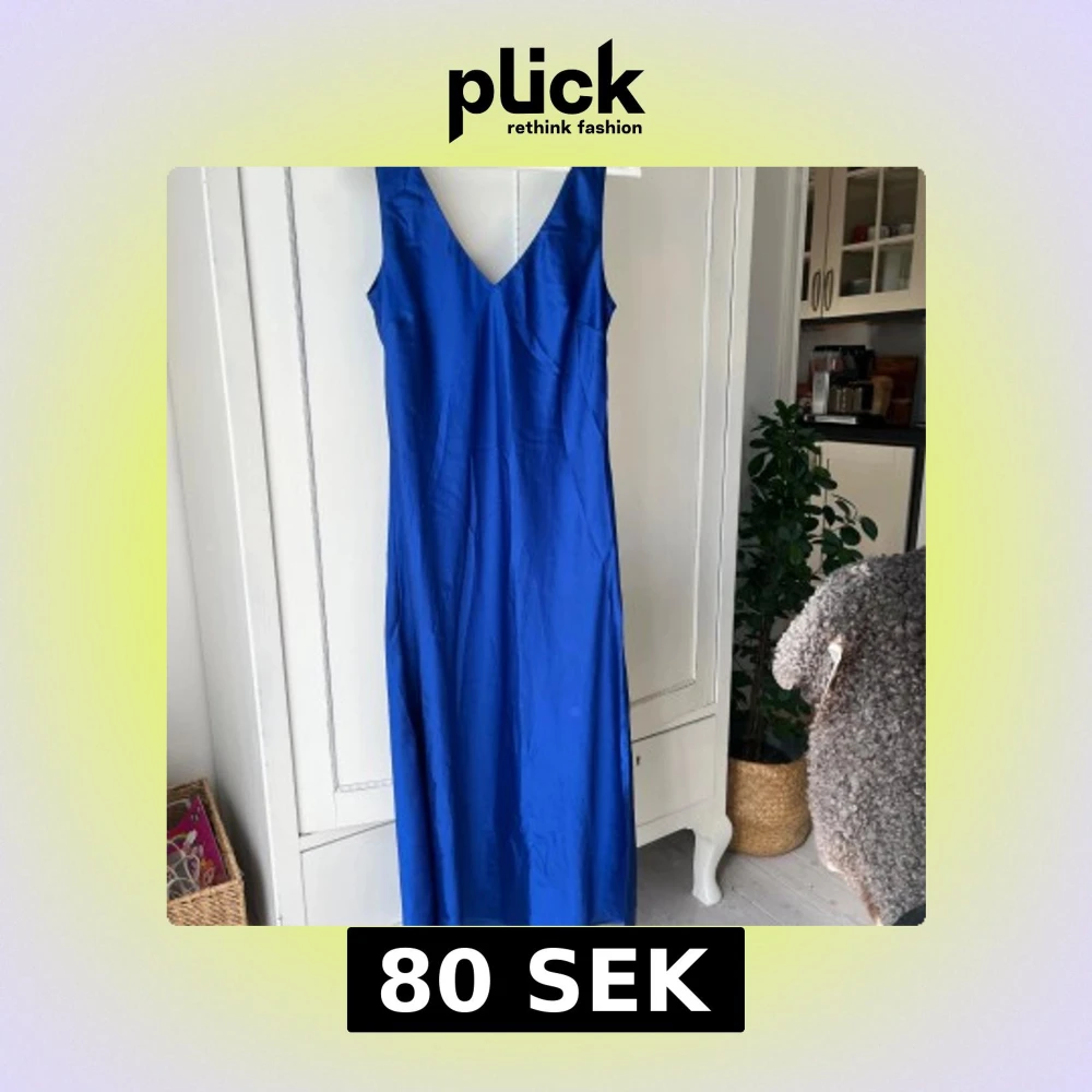 Snygg blå långklänning med djup v-ringning och breda axelband. Klänningen är ärmlös och har en rak siluett som faller längs kroppen. Materialet har ett lätt glansigt tyg. Aldrig använd!🥰🥰