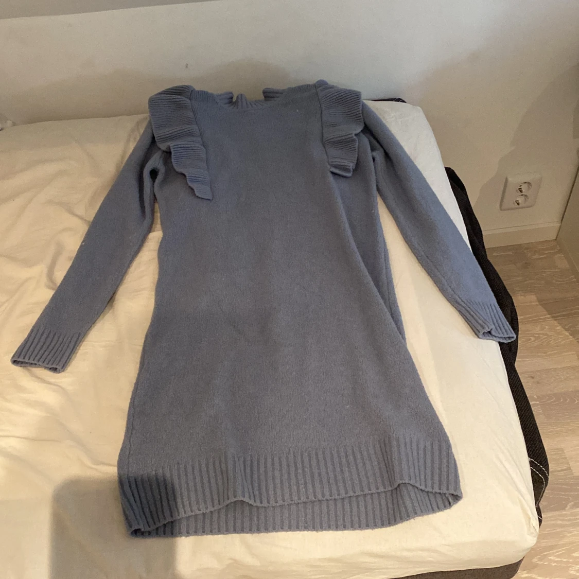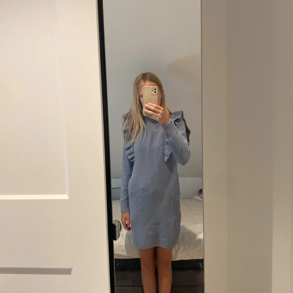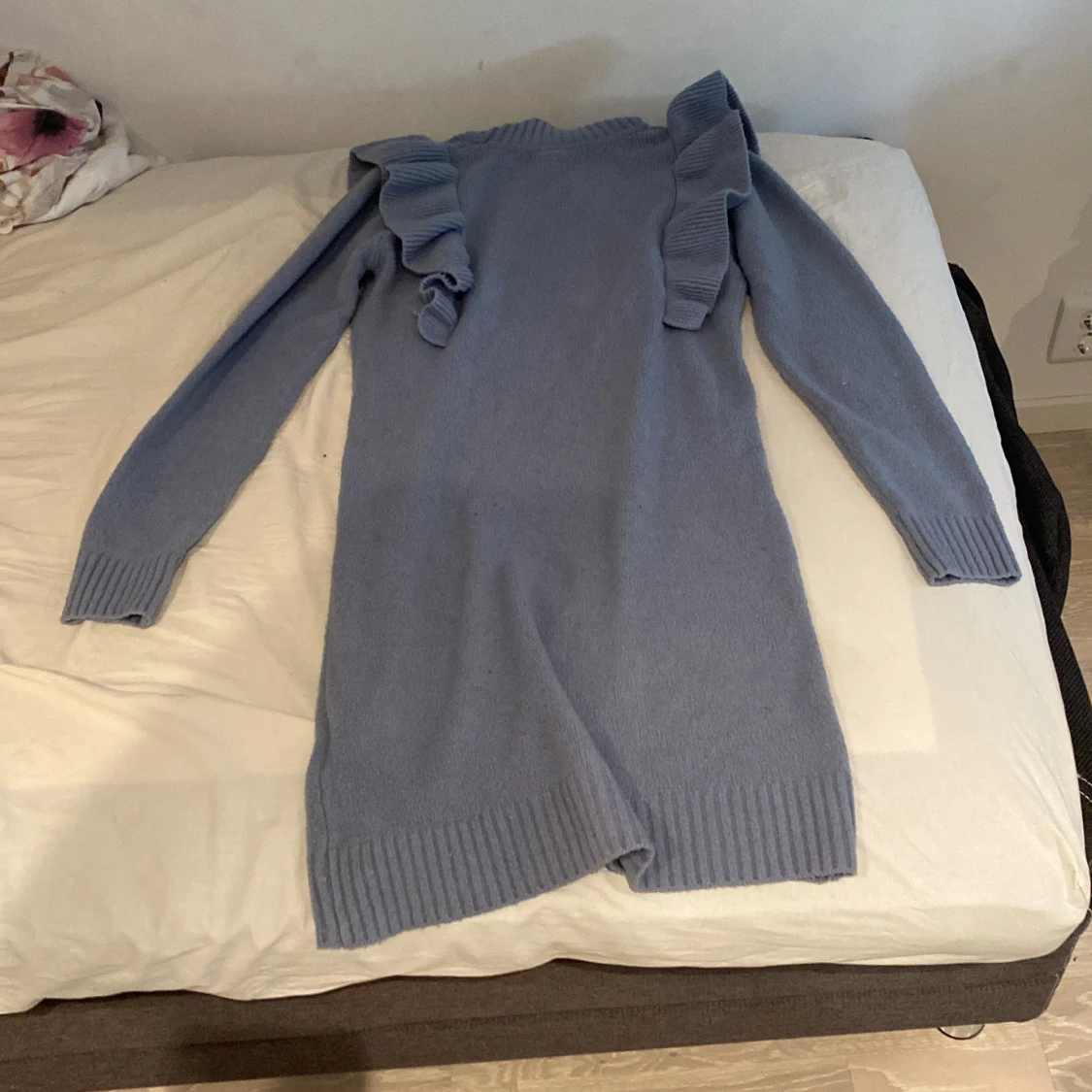Säljer en superfin ljusblå stickad klänning från Lindex i storlek 146/152 (10-12 år). Klänningen har långa ärmar och fina volangdetaljer på axlarna. Perfekt för höst och vinter, e super mysig🩵