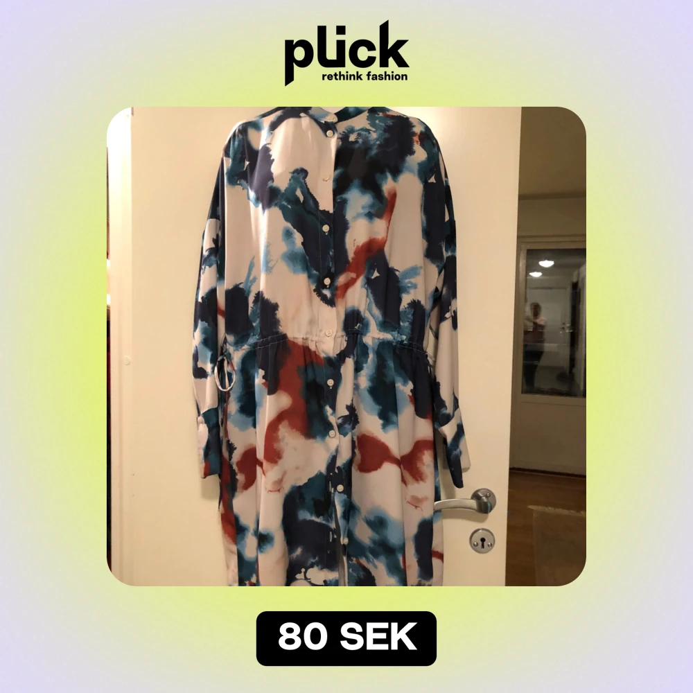 Säljer en superfin klänning från Lindex i storlek S. Den har ett unikt mönster i blått, rött och vitt med knappar framtill. Klänningen är långärmad och har en avslappnad passform, perfekt för både vardag och fest. Materialet känns mjukt och skönt mot huden. Passa på att fynda denna coola klänning!