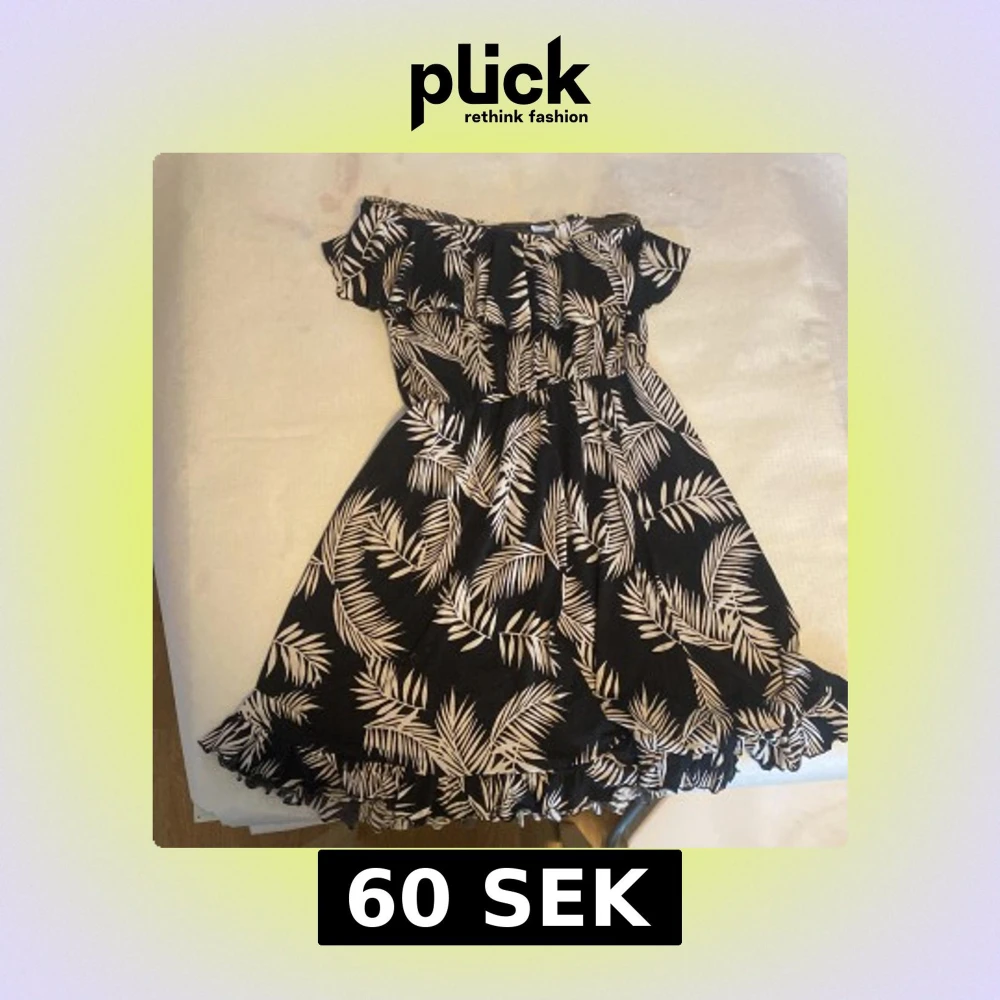 Snygg svart och vit klänning från Lindex med tropiskt bladmotiv. Klänningen har offshoulder-design och volangdetaljer vid fållen. Perfekt för sommarens varma dagar.