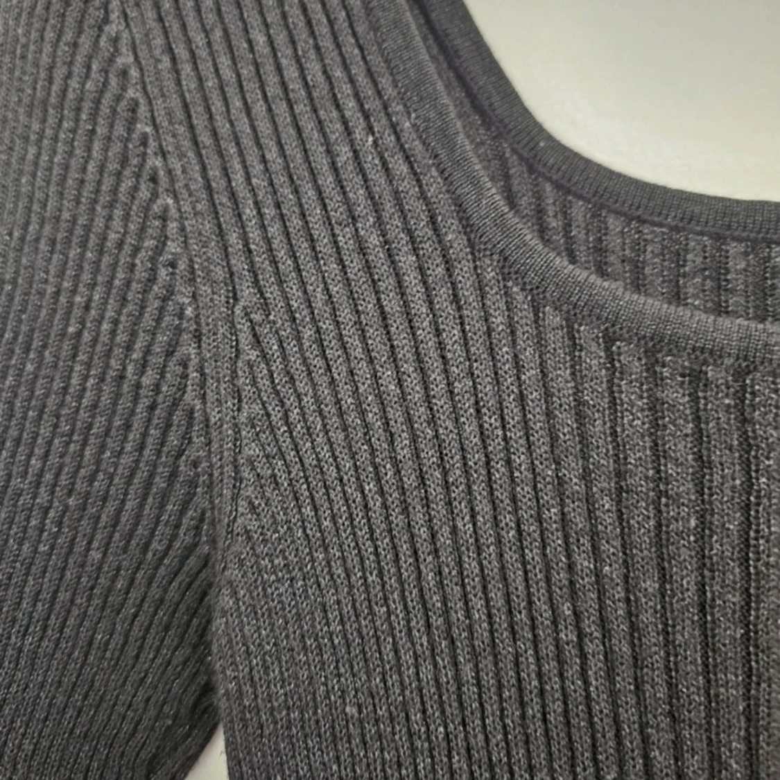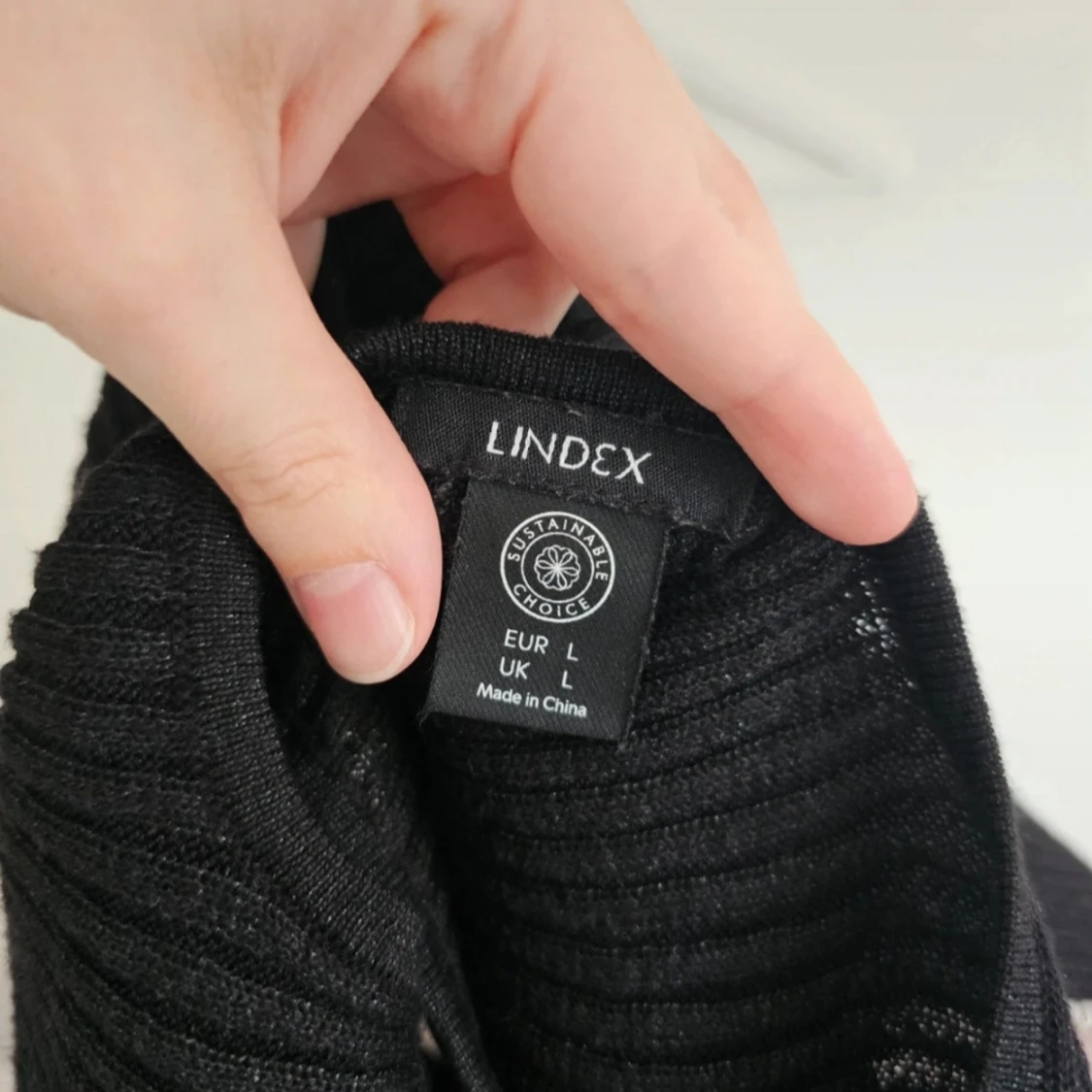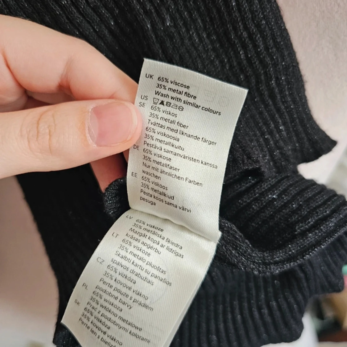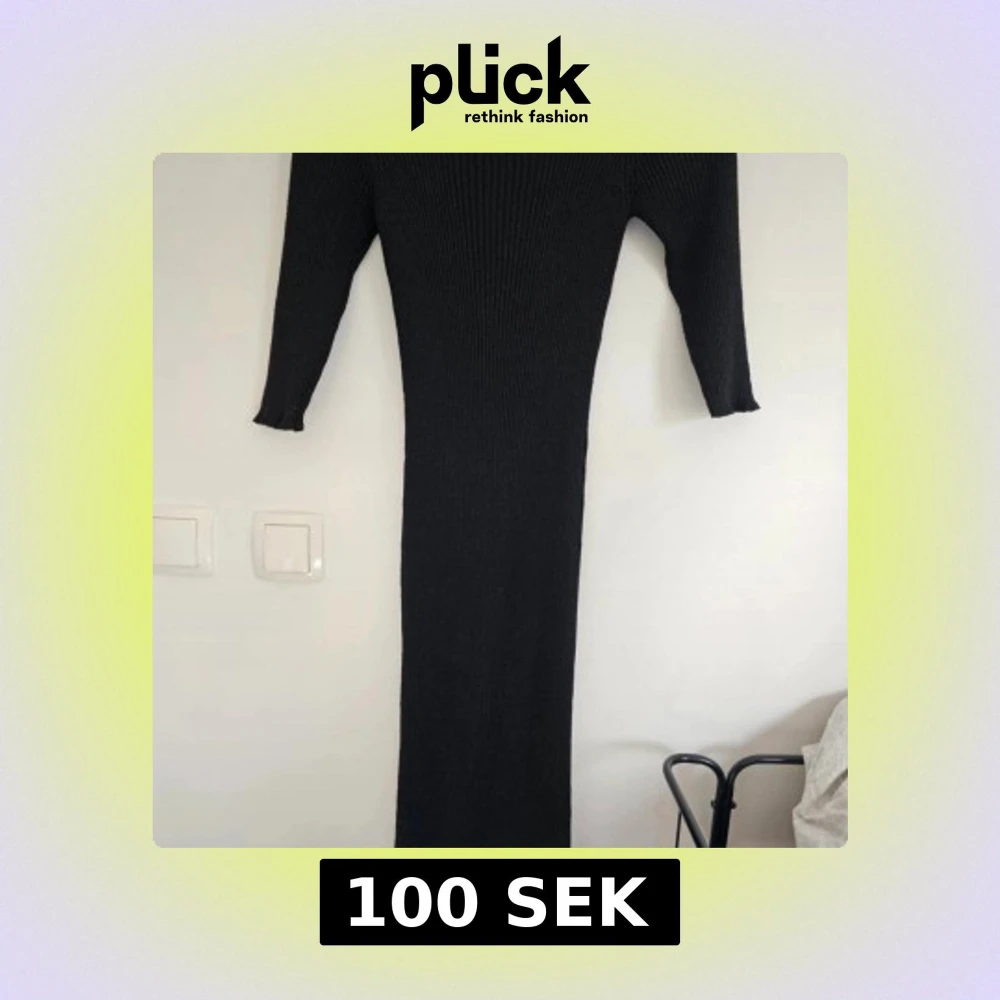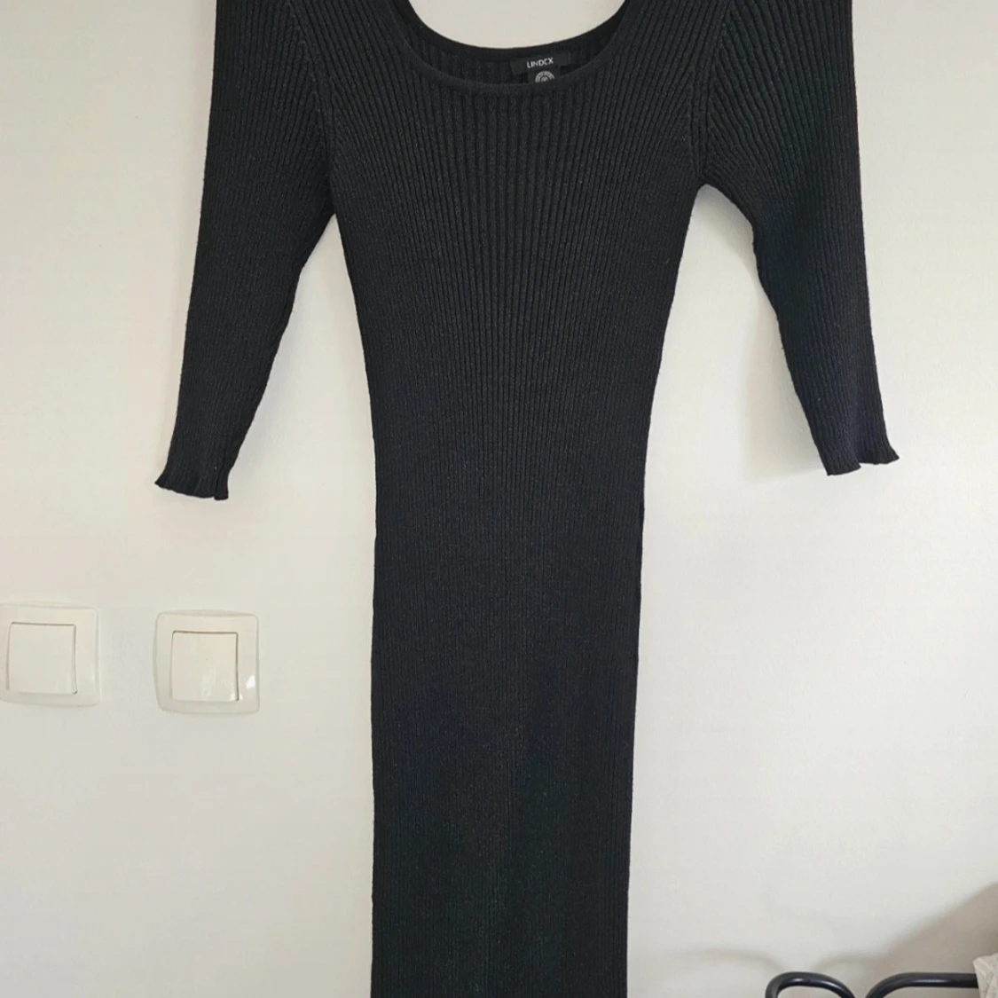 Säljer en svart ribbad långklänning från Lindex med rund hals och långa ärmar. Klänningen är stickad i en blandning av viskos och metallfiber, vilket ger en snygg glansig finish. Perfekt för dig som gillar en stilren och bekväm look med lite edge.