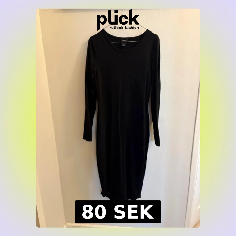Enkel och stilren svart klänning från Lindex i mjukt material. Modellen är långärmad och har en rak, kroppsnära passform med rund halsringning. Perfekt basplagg att styla på olika sätt.