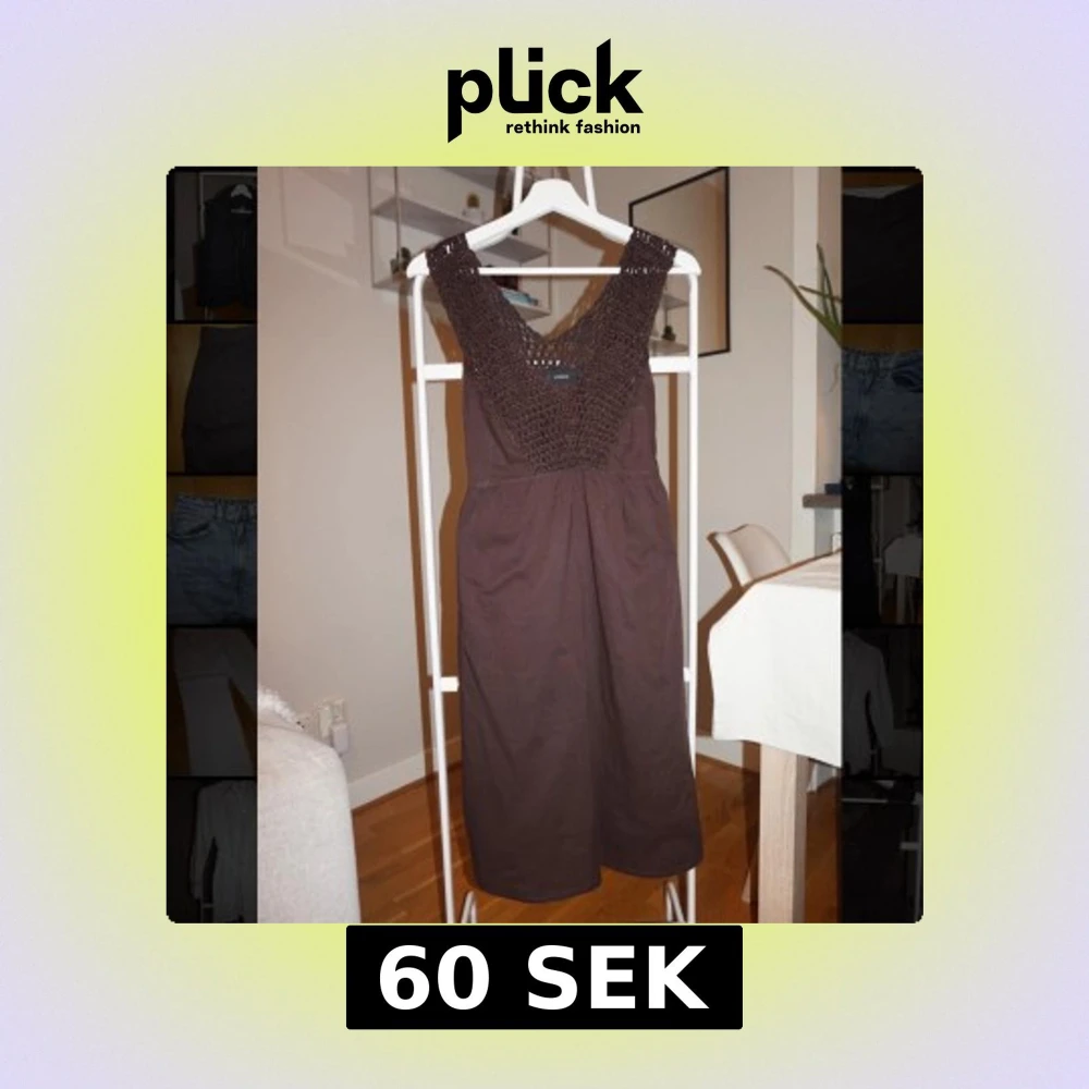 Snygg brun långklänning från Lindex med virkad överdel och v-ringning. Klänningen har breda axelband, knyt i midjan och är ärmlös. Perfekt för sommarens varma dagar och har en avslappnad men trendig look.