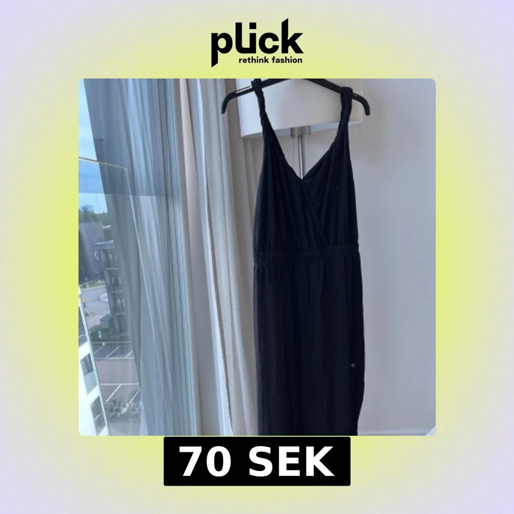 Svart långklänning från Lindex med omlott framtill och twistade axelband. Klänningen har en snygg öppen rygg med knutdetalj och är tillverkad i mjukt material. Perfekt för dig som gillar stilrena och bekväma plagg med coola detaljer.