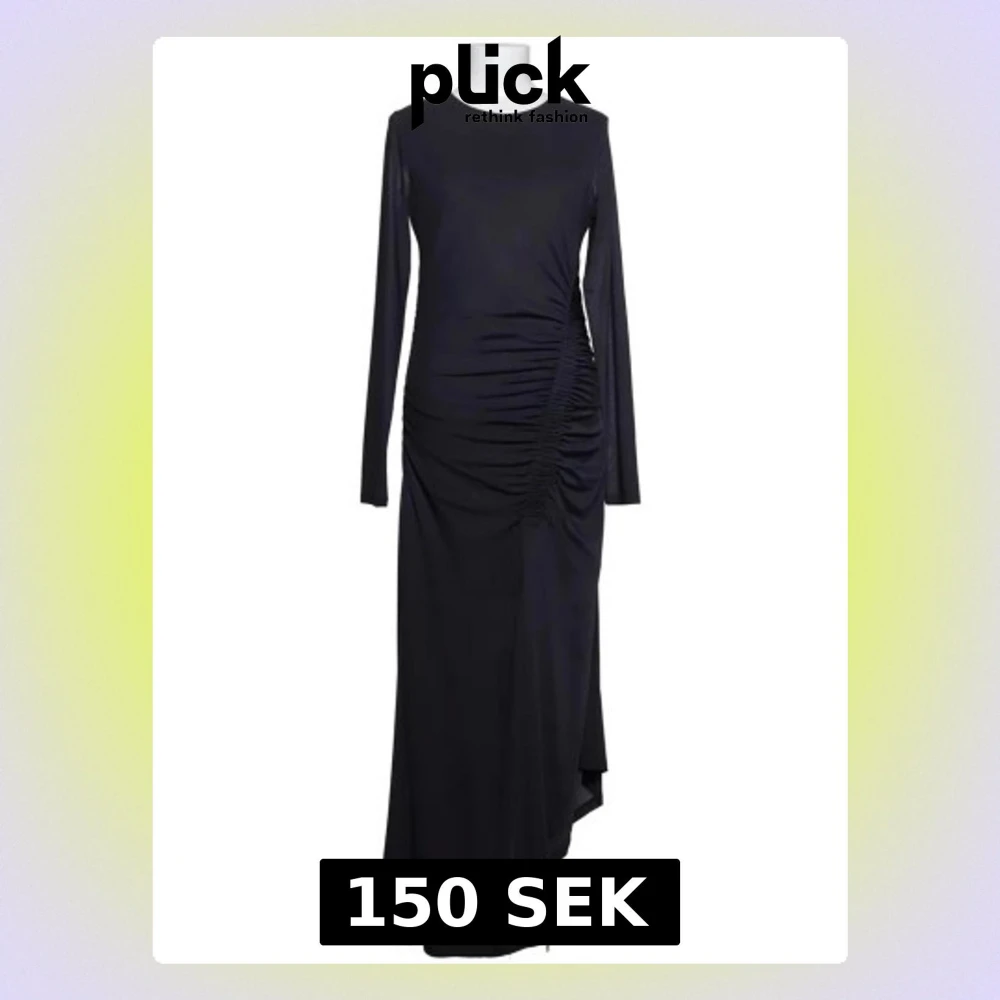 OBS!! Både lappen i midjan & den i nacken är bortklippta, minns dock att den var från lindex & tror storlek M, kan lika gärna vara S men är inte 100% säker, så storlek S/M. Elegant svart långklänning med långa ärmar och rund halsringning. Klänningen har snygga rynkade detaljer längs sidan som ger en cool siluett. Tillverkad i ett mjukt och följsamt material som faller snyggt. Perfekt för dig som vill ha en stilren och trendig look.