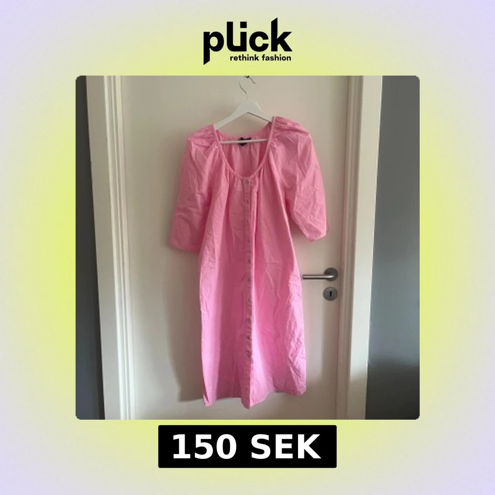 Rosa klänning från Lindex i bomull med knappar hela vägen framtill. Modellen har trekvartsärm, rundad halsringning och en avslappnad passform.