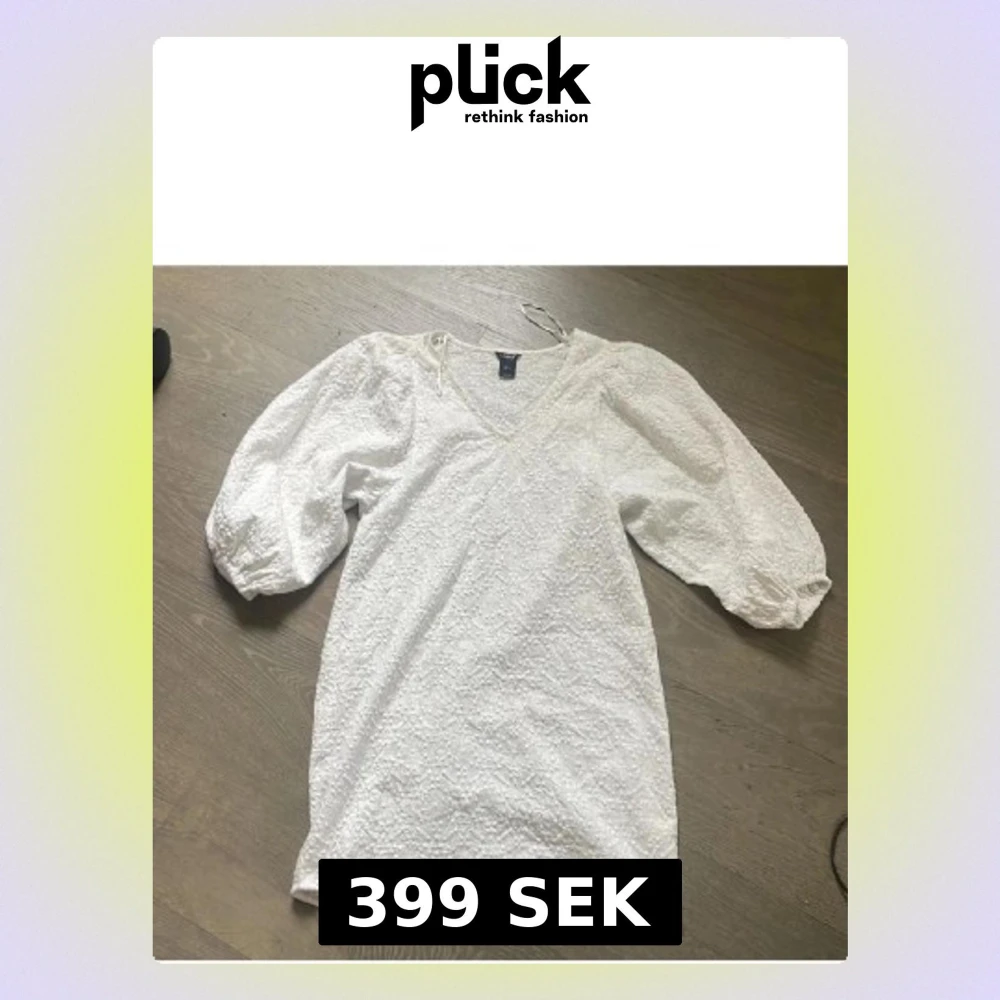 Superfin vit omlottklänning från Lindex med puffiga trekvartsärmar och v-ringning. Klänningen har ett diskret spetsmönster i tyget och knytband vid axeln. Perfekt för sommarens alla tillfällen!