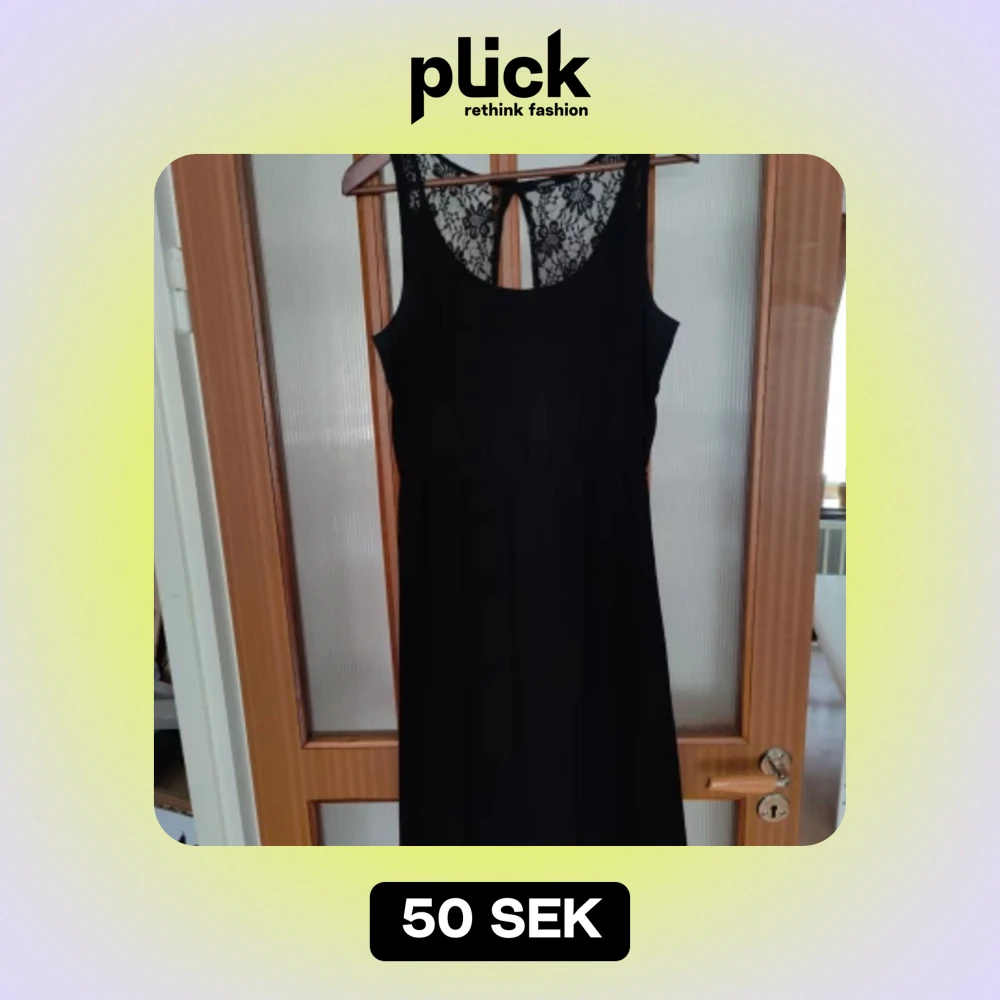 Svart klänning med spetsdetaljer i rygg och axelband. Fint skirt tyg. Storlek S