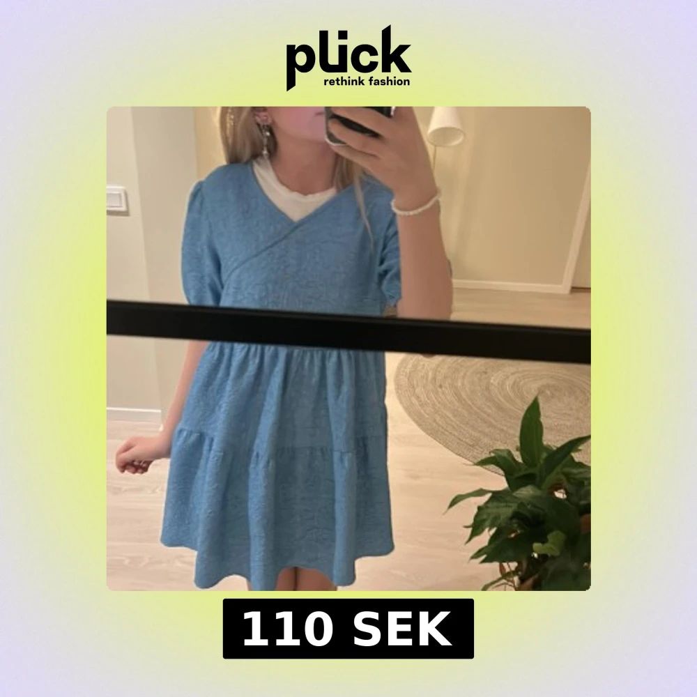 Säljer en söt blå klänning från Lindex med korta ärmar och omlott-design. Klänningen har en fin struktur och är perfekt för sommarens varma dagar. Den är gjord i ett mjukt material som känns skönt mot huden.