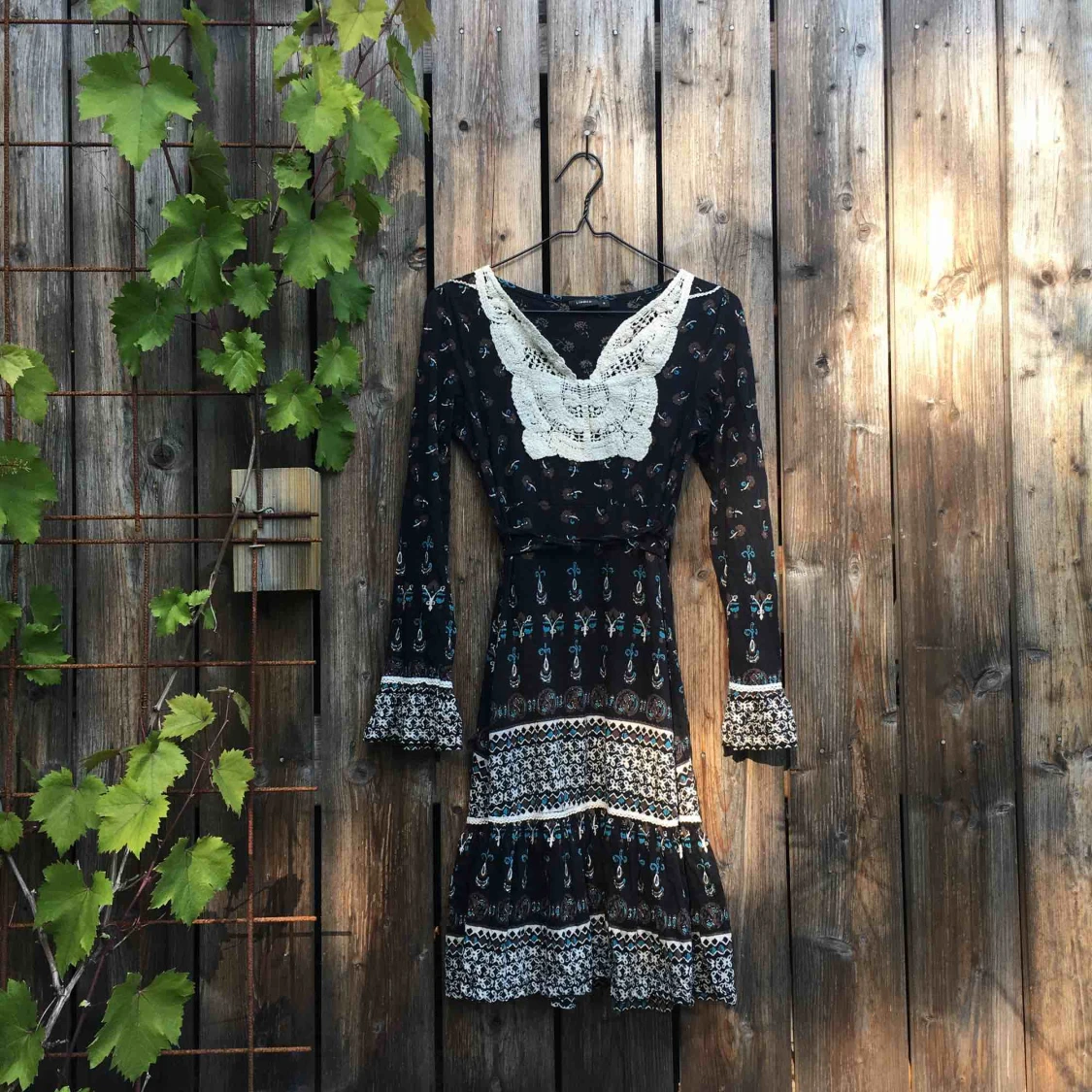 Mjuk, behaglig klänning som ändå ger dressad look. Knytband i midjan. Knälång kjol. Virkad dekoration kring urringningen.