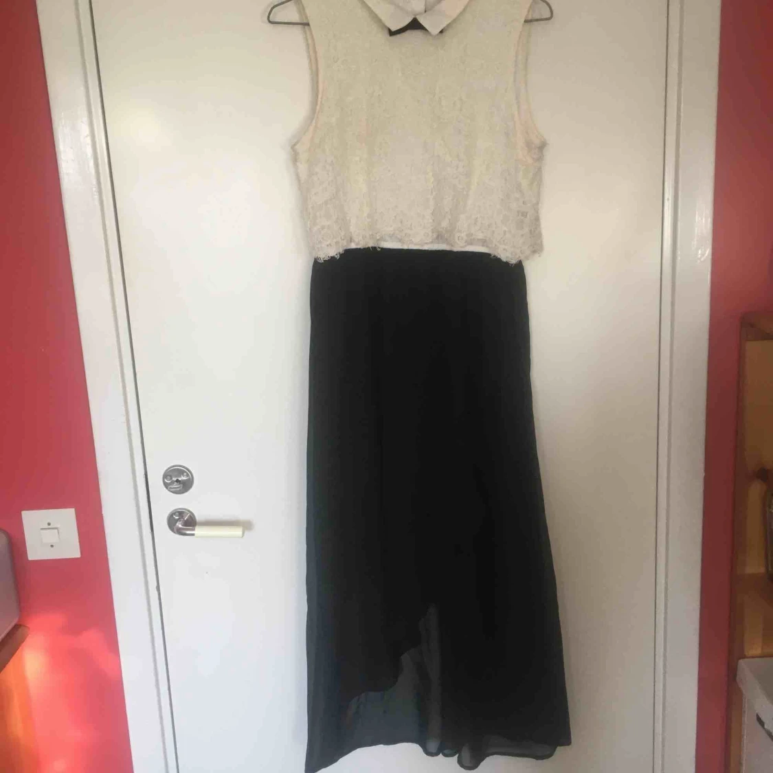 Lång klänning med spets upptill, fluga och krage