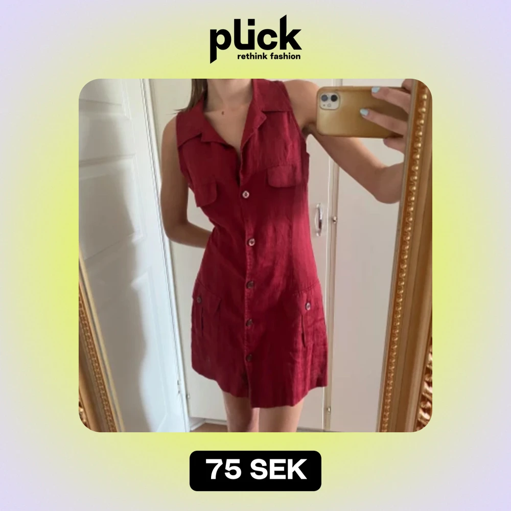 Snygg vinröd skjortklänning i linnematerial, ärmlös med röda knappar och fickor. Köpt second hand men aldrig använd. Mini-längd. En knapp saknas högst upp (se sista bild) men påverkar i min upplevelse inte passformen. Hör gärna av dig för mer info!