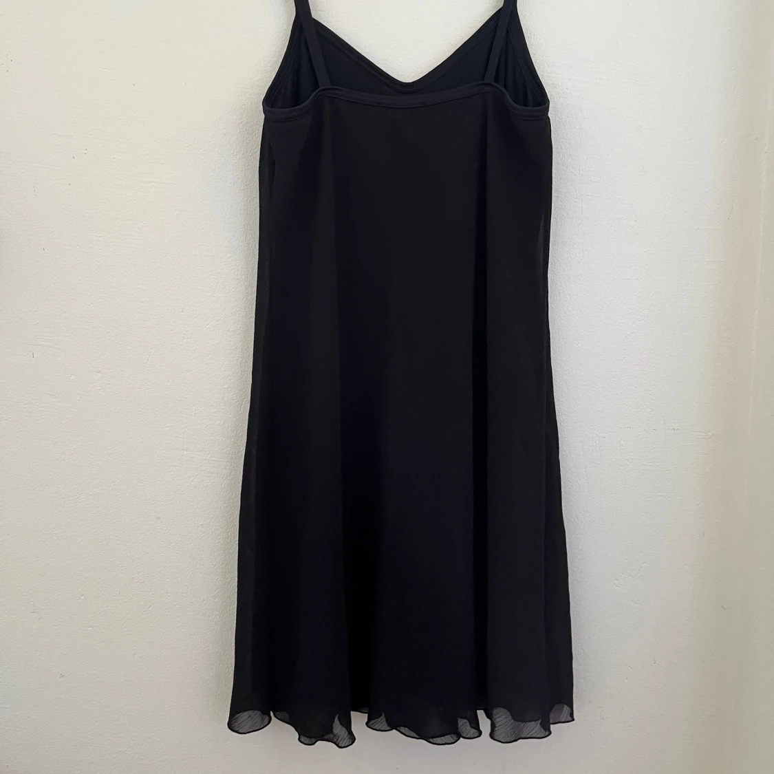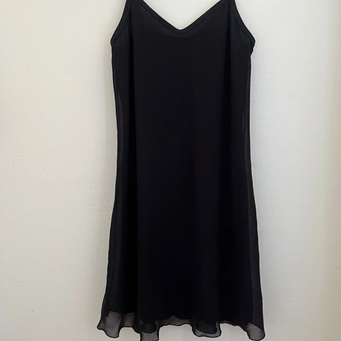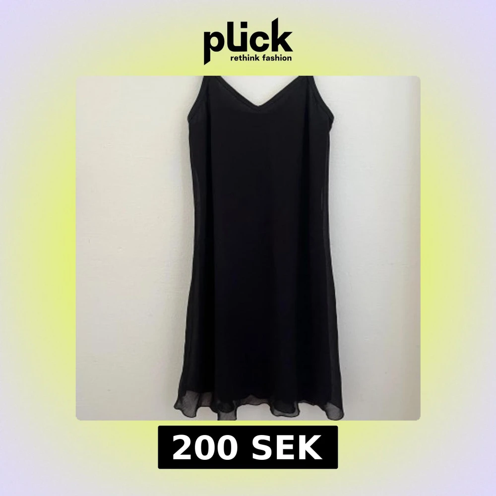 En svart, enkel och flowy kortklänning med tunna axelband och v-ringning. Klänningen har en lätt, luftig känsla och faller snyggt med en något vågig nederkant. Perfekt för dig som gillar minimalistisk stil och vill ha något bekvämt och stilrent.